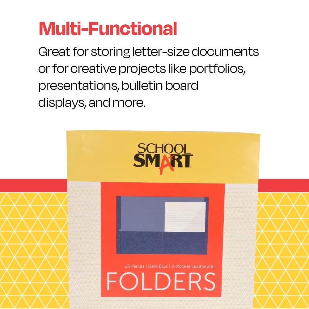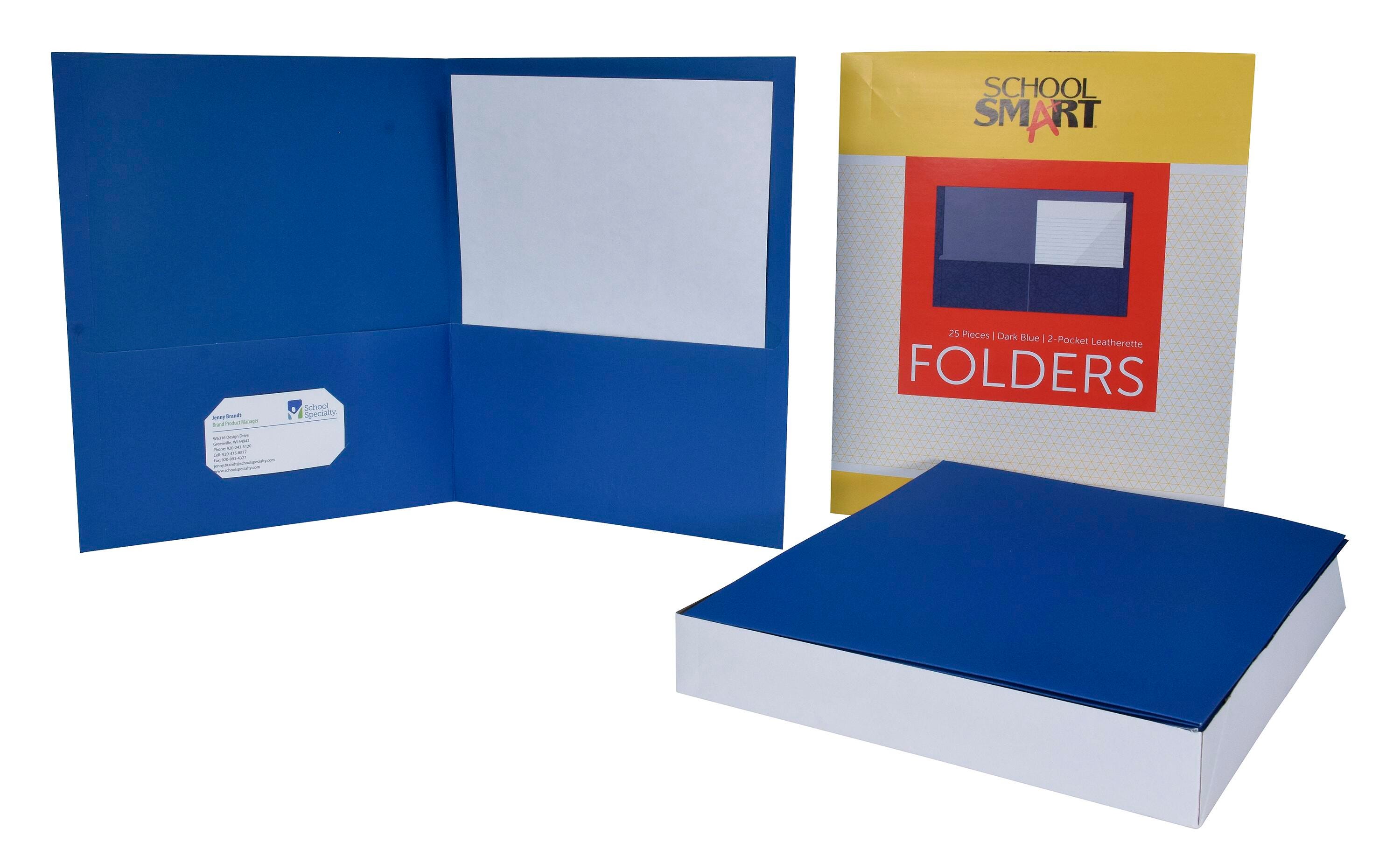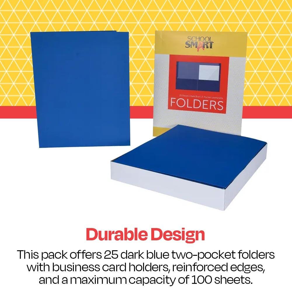 Organize your classroom, office, or home with the School Smart 2-pocket folders 25 pack. Our durable two pocket folders hold up to 100 sheets and come in a dark blue color. Use these blank 2-pocket folders for report covers, business presentations, or traditional storage for important documents. An embossed leatherette texture lends quality for both professional, school, and personal needs. The double pockets are closed on three sides (outer edge, top, and bottom) to ensure your papers stay securely in place, while double-reinforced edges provide extra durability when opening and closing.