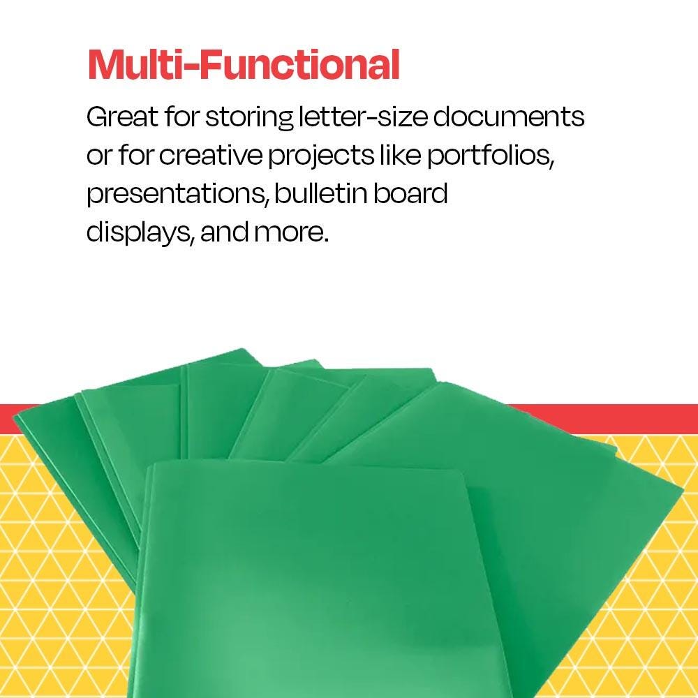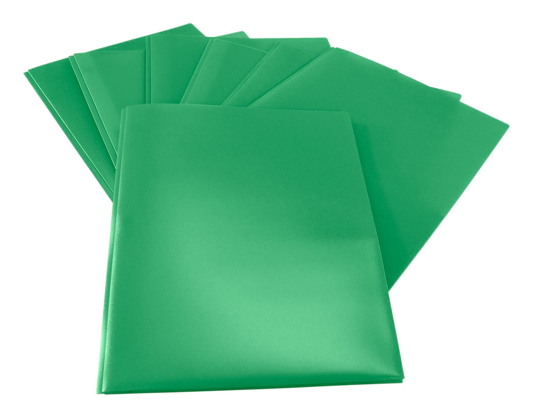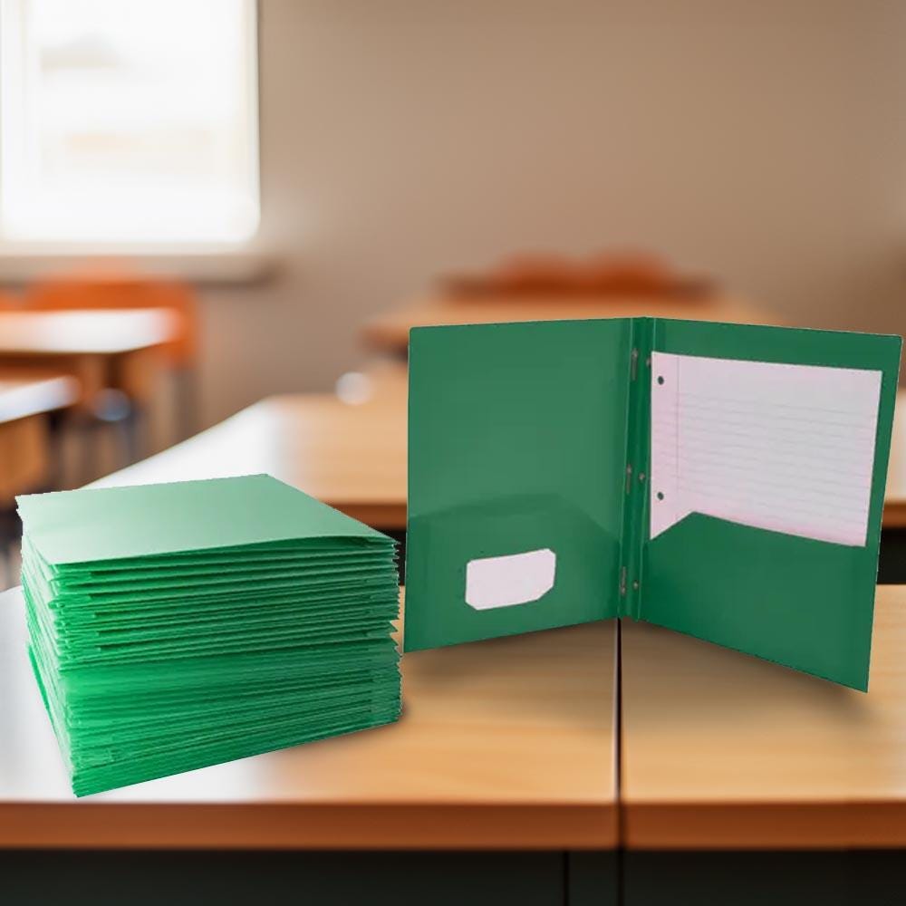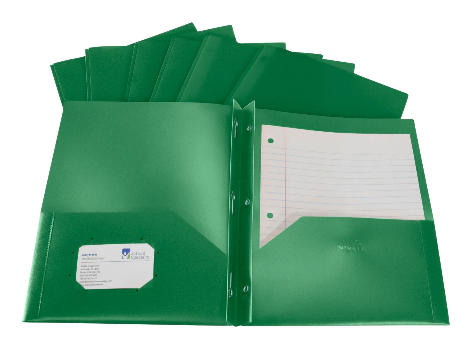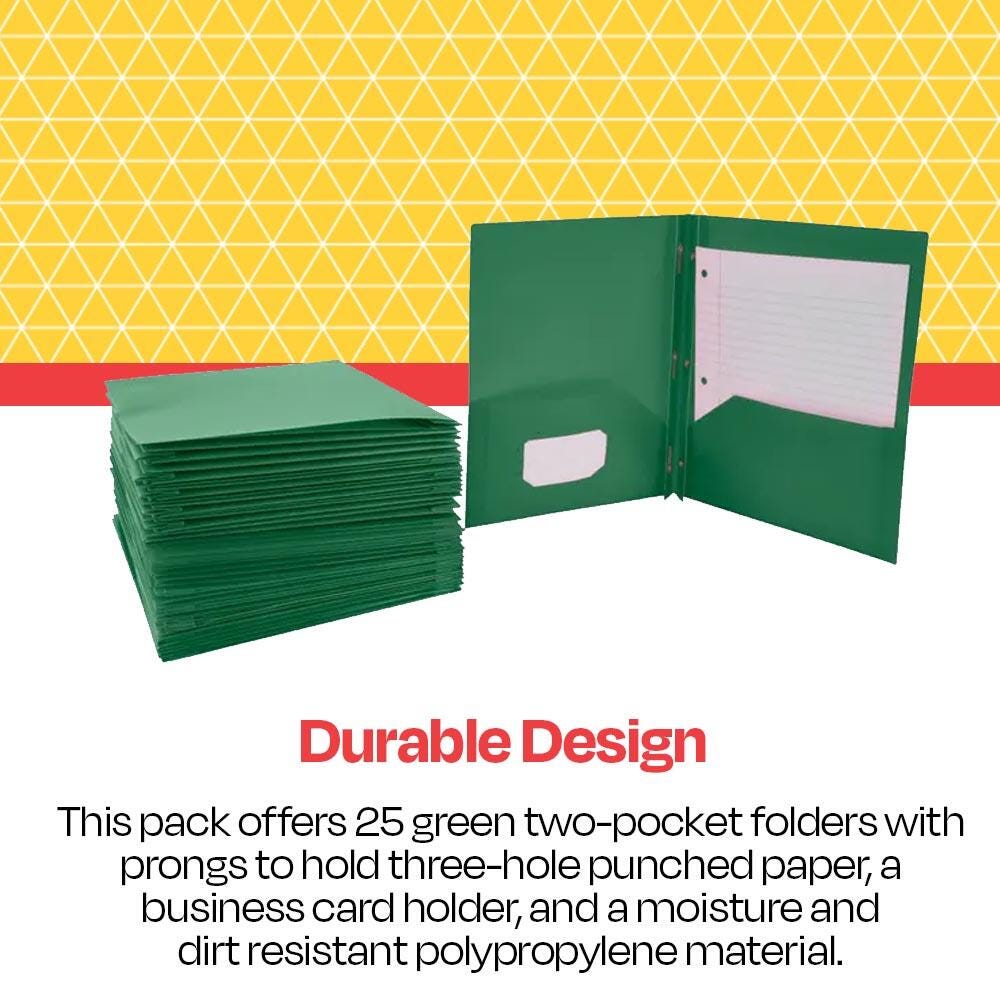 School Smart green 2-pocket poly folders with fasteners make it easy to compile and file important documents. Our durable two pocket folders help keep letter-size papers and sheets straight, neat, and accessible in the classroom, office, or home. Flexible and lightweight (yet built to last), each green plastic folder is made of durable polypropylene that resists moisture and dirt. The center includes an insert with push-down prongs to secure 3-hole punched documents and the left interior pocket has a business card holder. Use the heavy duty poly folder with brads for work, school, or personal use.