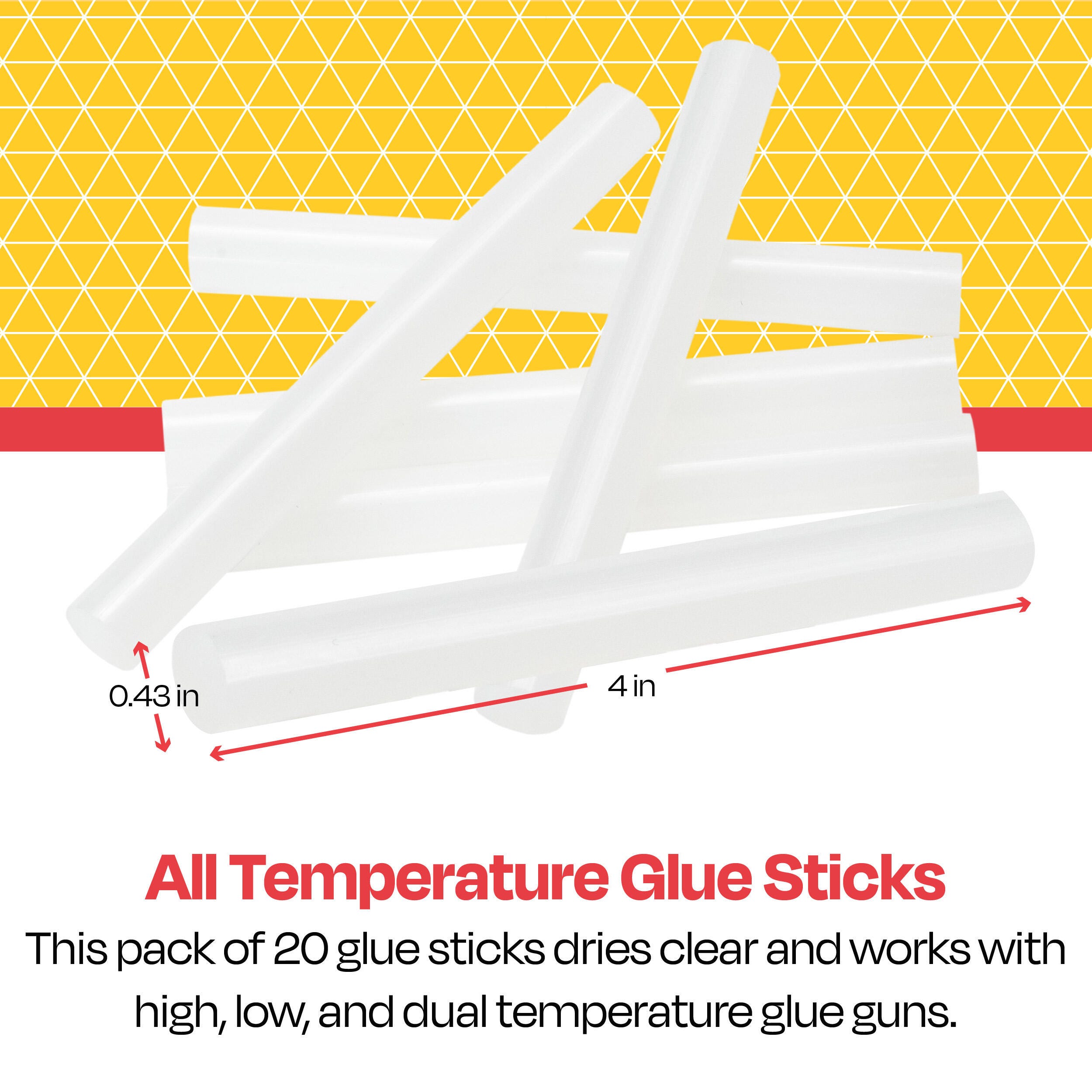 Stock up on crafts supplies with the School Smart glue gun glue sticks refill pack. This set includes 20 glues for arts and crafts and home repairs. Use the all temp glue sticks as hot melt glue sticks or low temperature glue sticks. Our all temperature clear glue sticks work with high, low, and dual temp glue guns.