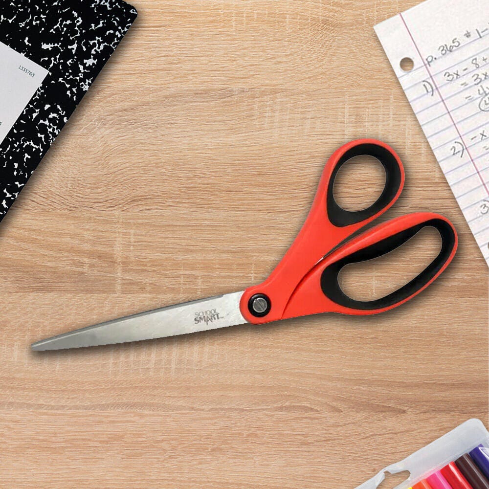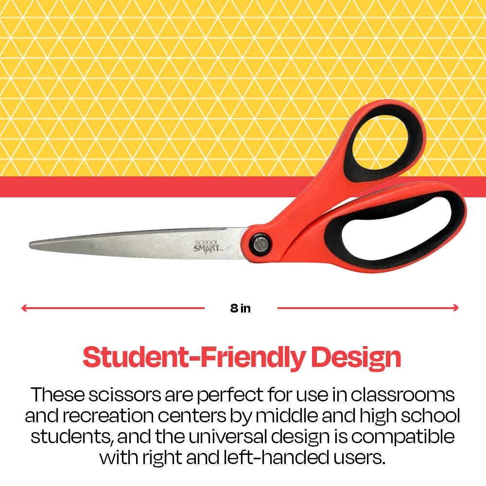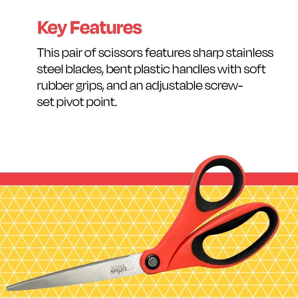 A perfect addition for the class or office, School Smart 8 inch bent scissors have pointed tip stainless steel blades and bent plastic handles. The durable handles are molded to the scissor and have a soft grip material in the finger loops for extra comfort. Get consistent cutting action whether you’re a student in middle or high school or an experienced adult at work.Features