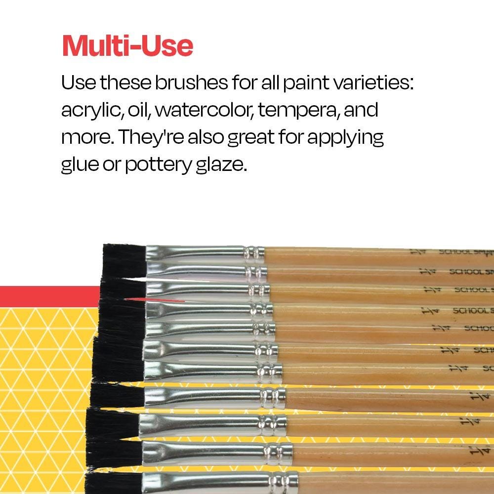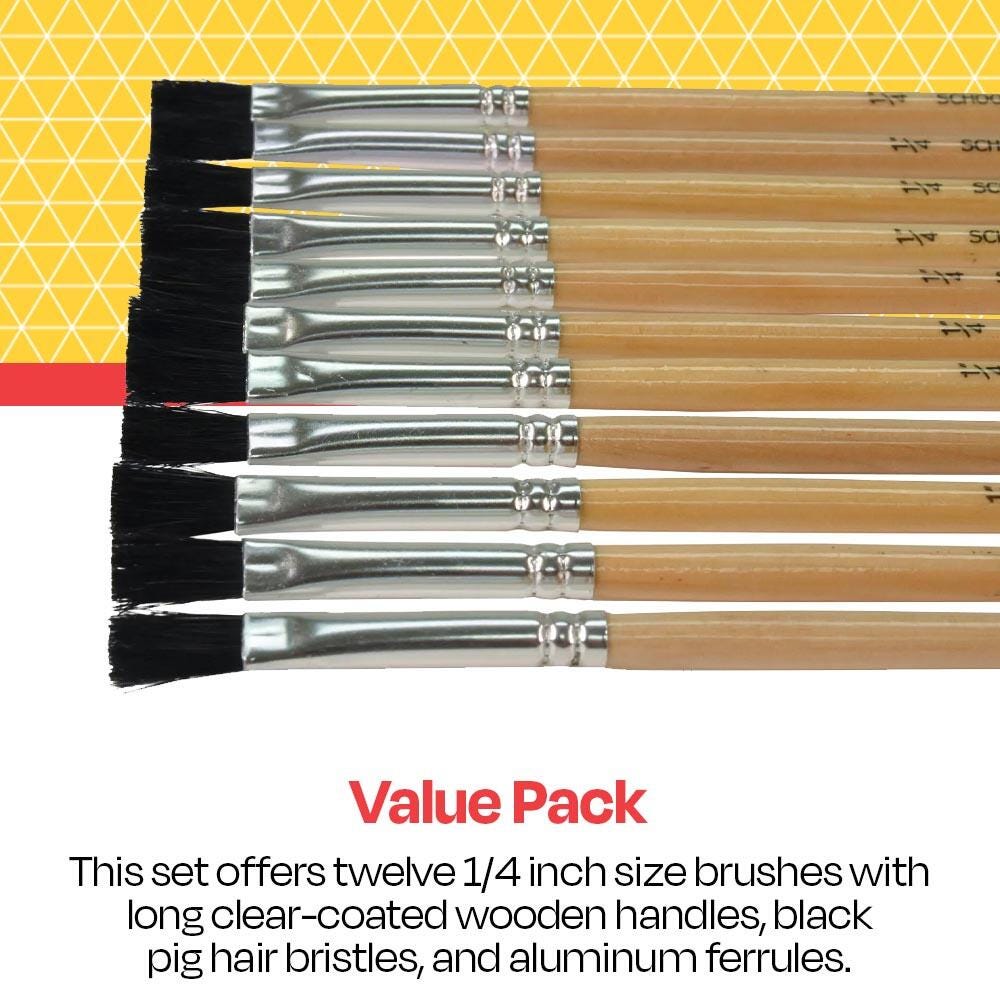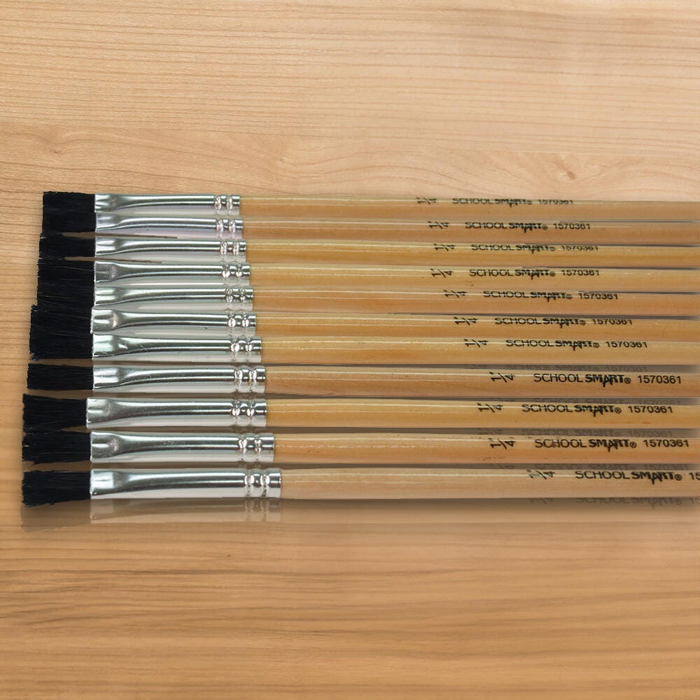 Ideal for many types of mediums, the School Smart black bristle, flat paint brush set has 12 traditional wooden brushes. The long handled paint brushes have interlocked pig hair bristles in seamless, smooth aluminum ferrules. Each hardwood handle is clear-coated and easy to use and hold. Perfect for schools, classrooms, and recreation centers, our affordable art tools help you stock up and save.Features