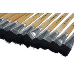 Ideal for many types of mediums, the School Smart black bristle, flat paint brush set has 12 traditional wooden brushes. The long handled paint brushes have interlocked pig hair bristles in seamless, smooth aluminum ferrules. Each hardwood handle is clear-coated and easy to use and hold. Perfect for schools, classrooms, and recreation centers, our affordable art tools help you stock up and save.Features