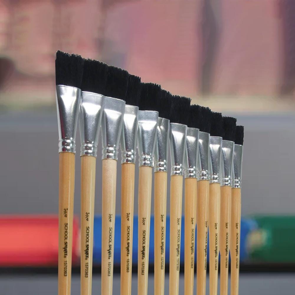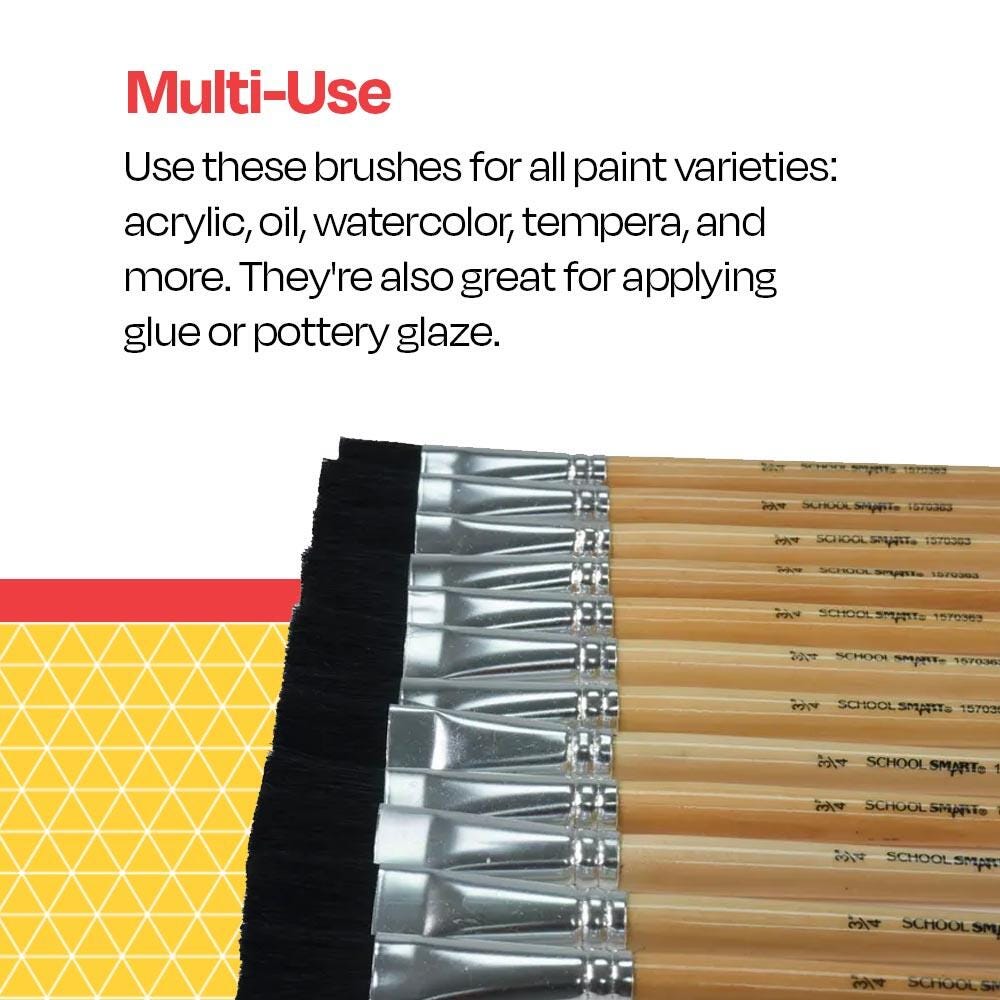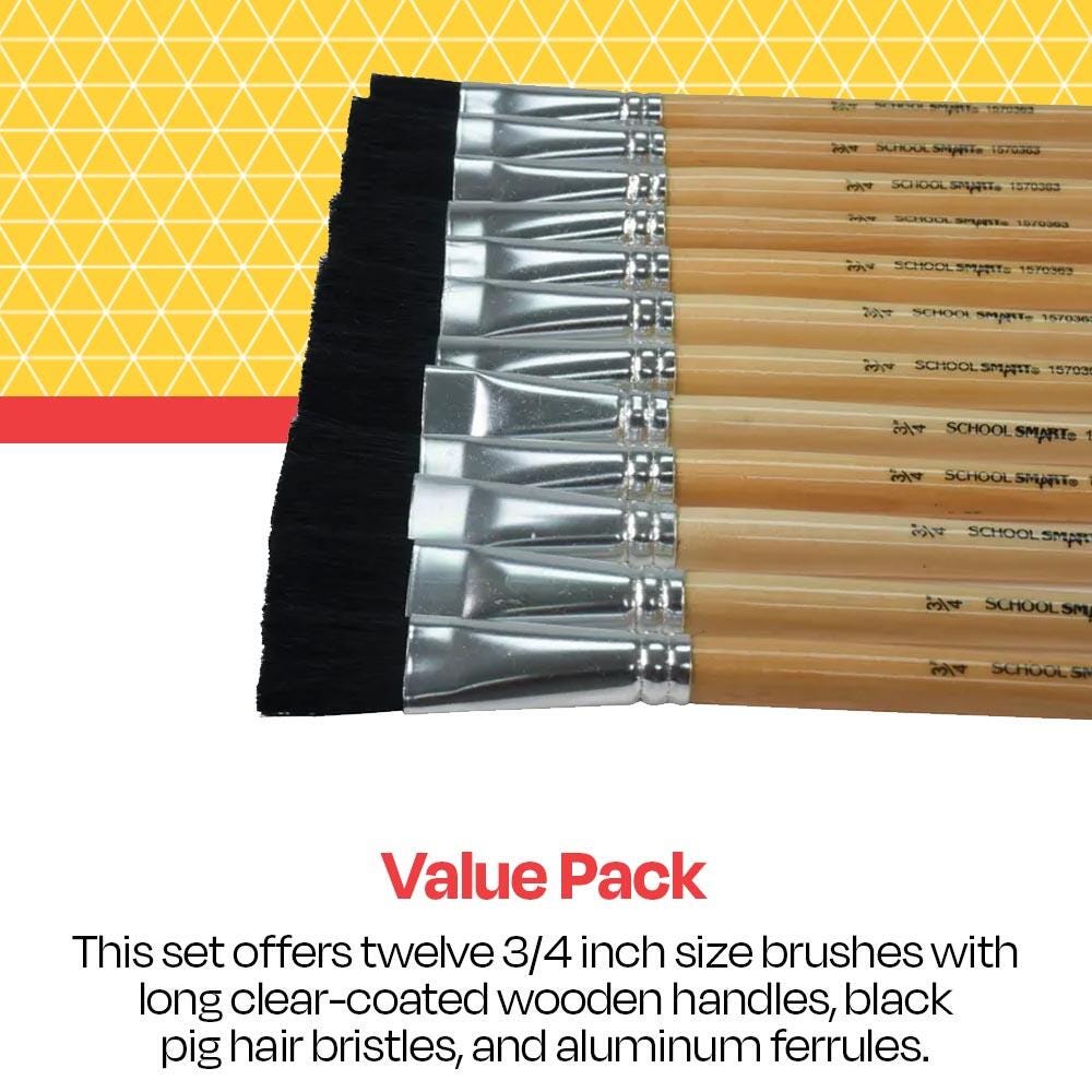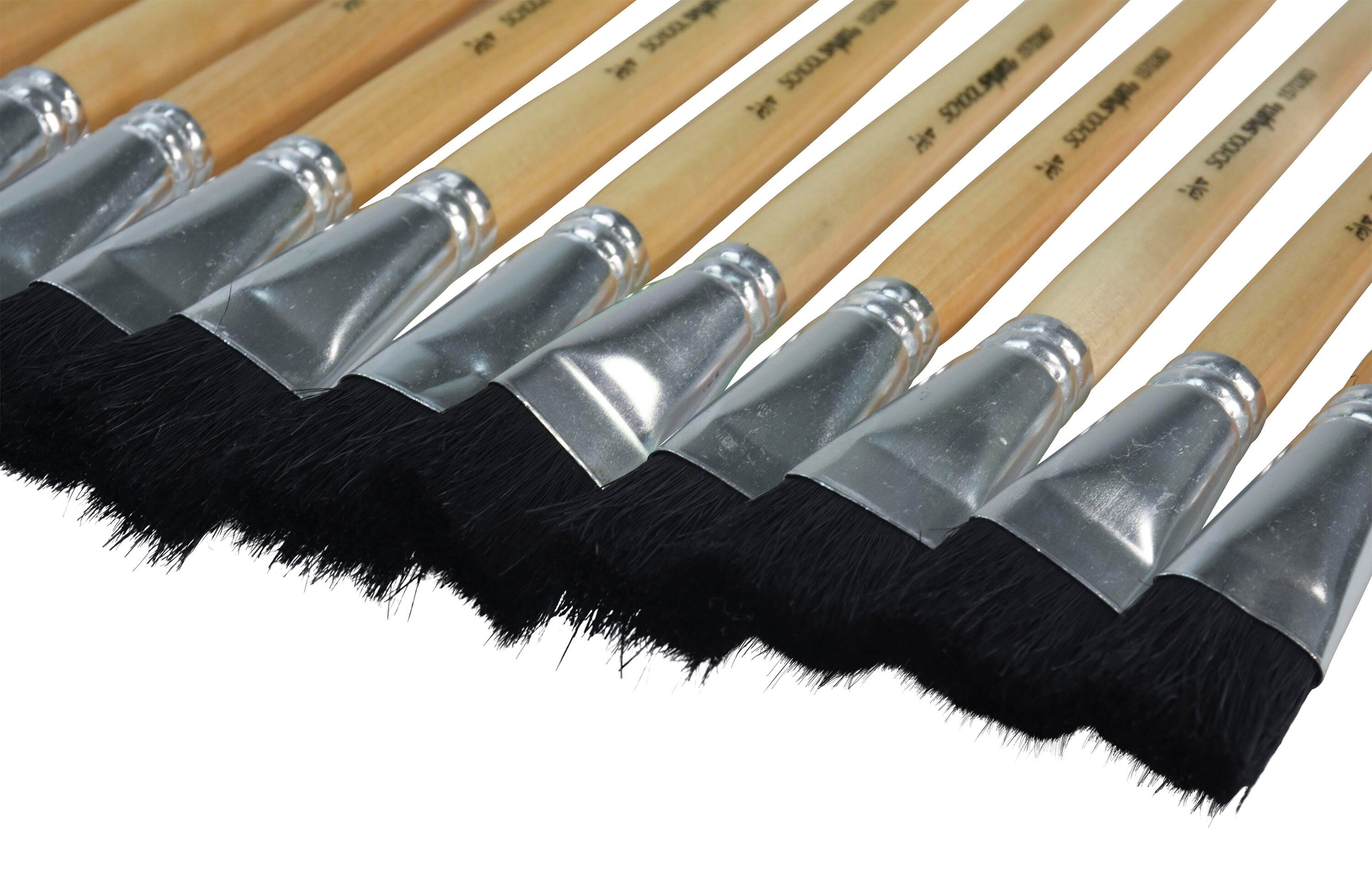 Ideal for many types of mediums, the School Smart black bristle, flat paint brush set has 12 traditional wooden brushes. The long handled paint brushes have interlocked pig hair bristles in seamless, smooth aluminum ferrules. Each hardwood handle is clear-coated and easy to use and hold. Perfect for schools, classrooms, and recreation centers, our affordable art tools help you stock up and save.Features