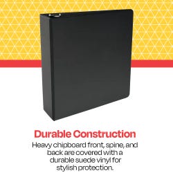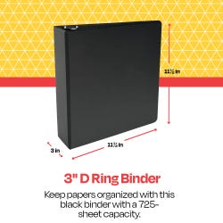 Compile your papers, notes, records, and other essential paperwork inside the School Smart black 3 inch D ring binder. Our binder design has a heavy-gauge chipboard front, back, and spine with a durable suede vinyl cover for extra protection and style. The D ring mechanisms are D-shaped and easy to open and close, so you can store and organize important sheets of paper in your large 3 ring binder. Made of polypropylene, the sturdy binder also has two deep inner pockets to hold loose sheets of paper. Our D ring file has a 625 sheet capacity, and the entire black binder measures 11-1/2 x 11-1/2 inches.Features