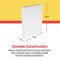 Compile your papers, notes, records, and other essential paperwork inside the School Smart white 1 inch D ring binder. Our binder design has a heavy-gauge chipboard front, back, and spine with a durable suede vinyl cover for extra protection and style. The D ring mechanisms are D-shaped and easy to open and close, so you can store and organize important sheets of paper in your 3 ring binder. Made of polypropylene, the sturdy binder also has two deep inner pockets to hold loose sheets of paper. Our D ring file has a 225 sheet capacity, and the entire white binder measures 10 x 11-1/2 inches.Features