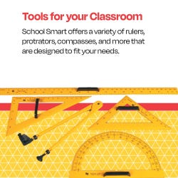 Designed specifically for use with chalk or markers, the School Smart drafting tools kit has a durable plastic construction. The drafting tools come in vibrant yellow with easy-to-read black markings. This classroom set includes a protractor that measures 14 inches, a meter stick with inch and metric calibrations, a 20/70 degree triangle, a 45/45 degree triangle, and a compass with 17 inch diameter max. Skinny dry erase markers fit seamlessly into the holes of each compass. The basic drafting kit for students has measuring tools with convenient protruding handles. The tools are NOT magnetic.Features