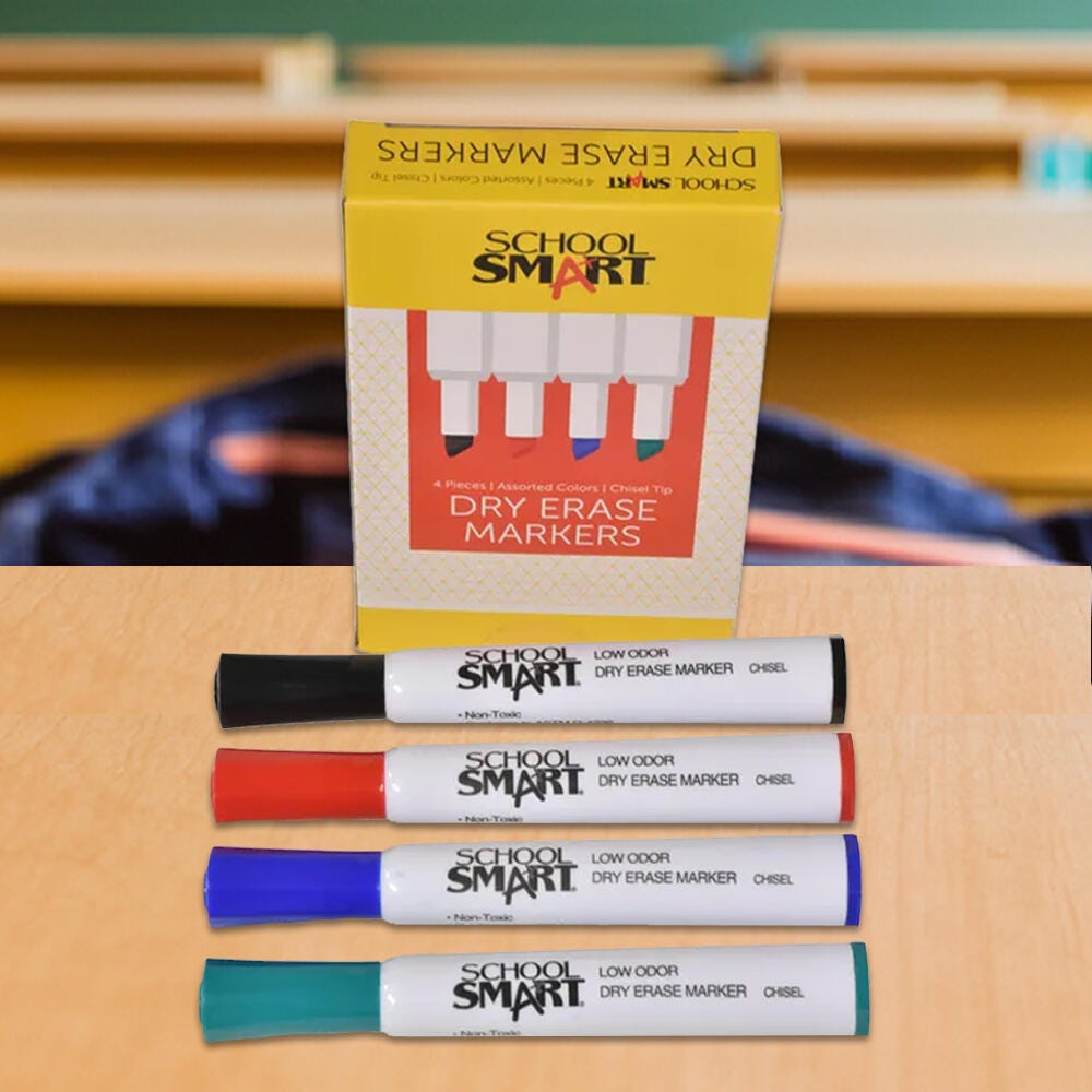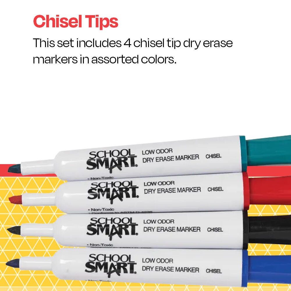 School Smart Dry Erase Markers, Chisel Tip, Low Odor, Assorted Colors, Pack of 4