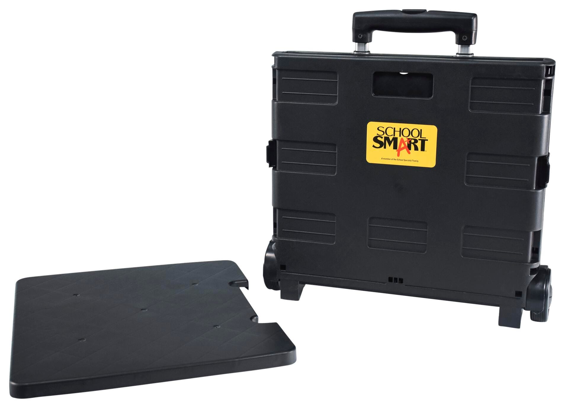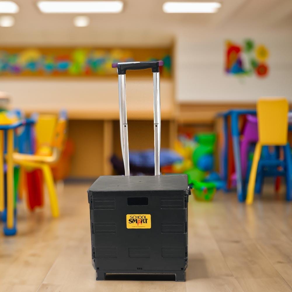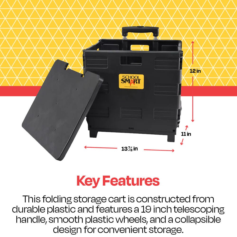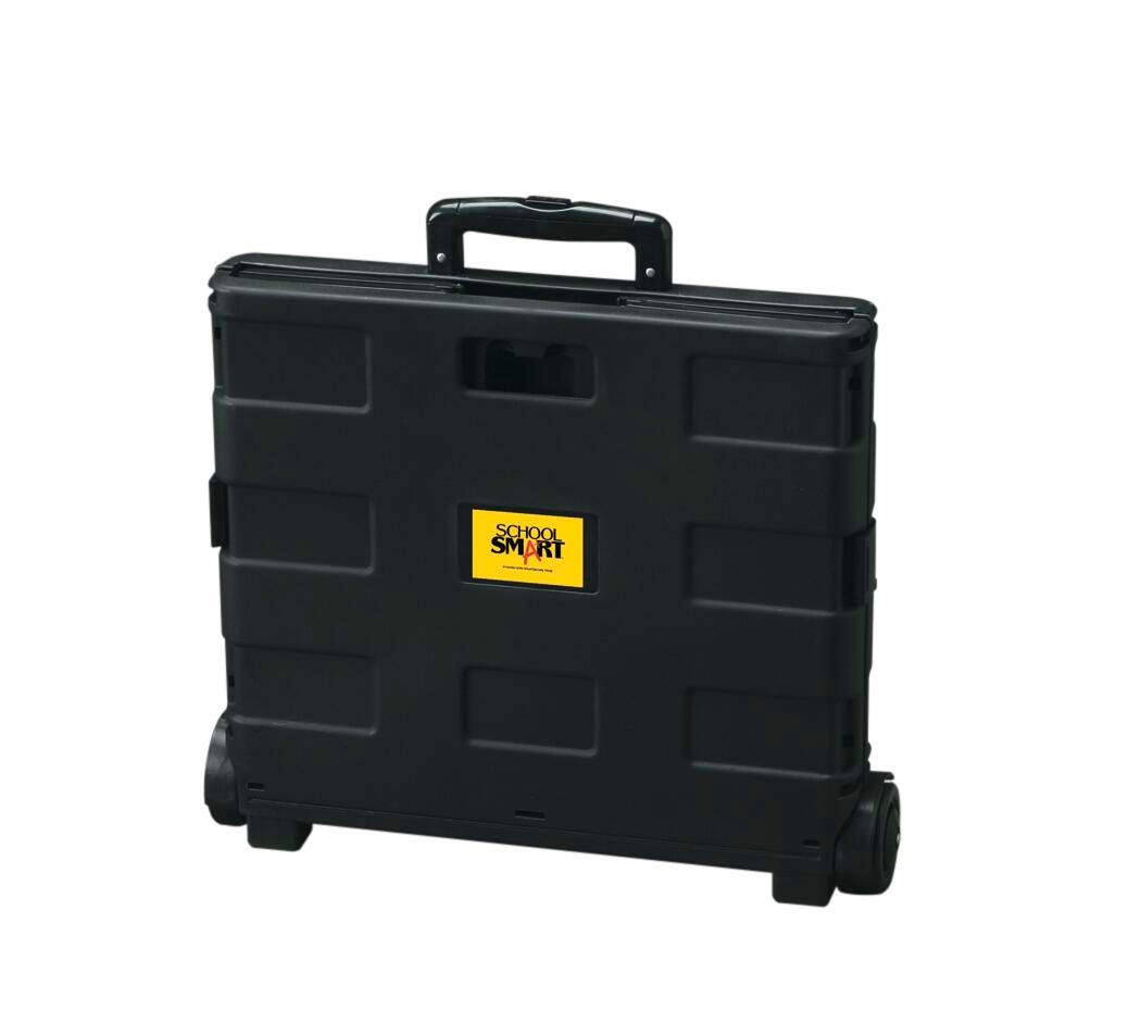 Take education on the go from room to room or school to school with the School Smart folding storage cart on wheels. Specially made for teachers and educators, our mobile file cart is ideal for toting documents, books, supplies, and more. This educators rolling file cart comes in a medium size, measuring 13-7/8 W x 11 D x 12 H inches. This cart has a comfortable to hold 19 inch telescoping handle and can be reduced to 3-1/4 inches when empty for easy storage. The foldable utility cart has wheels made of polypropylene, so you can take your teaching materials on the go.
