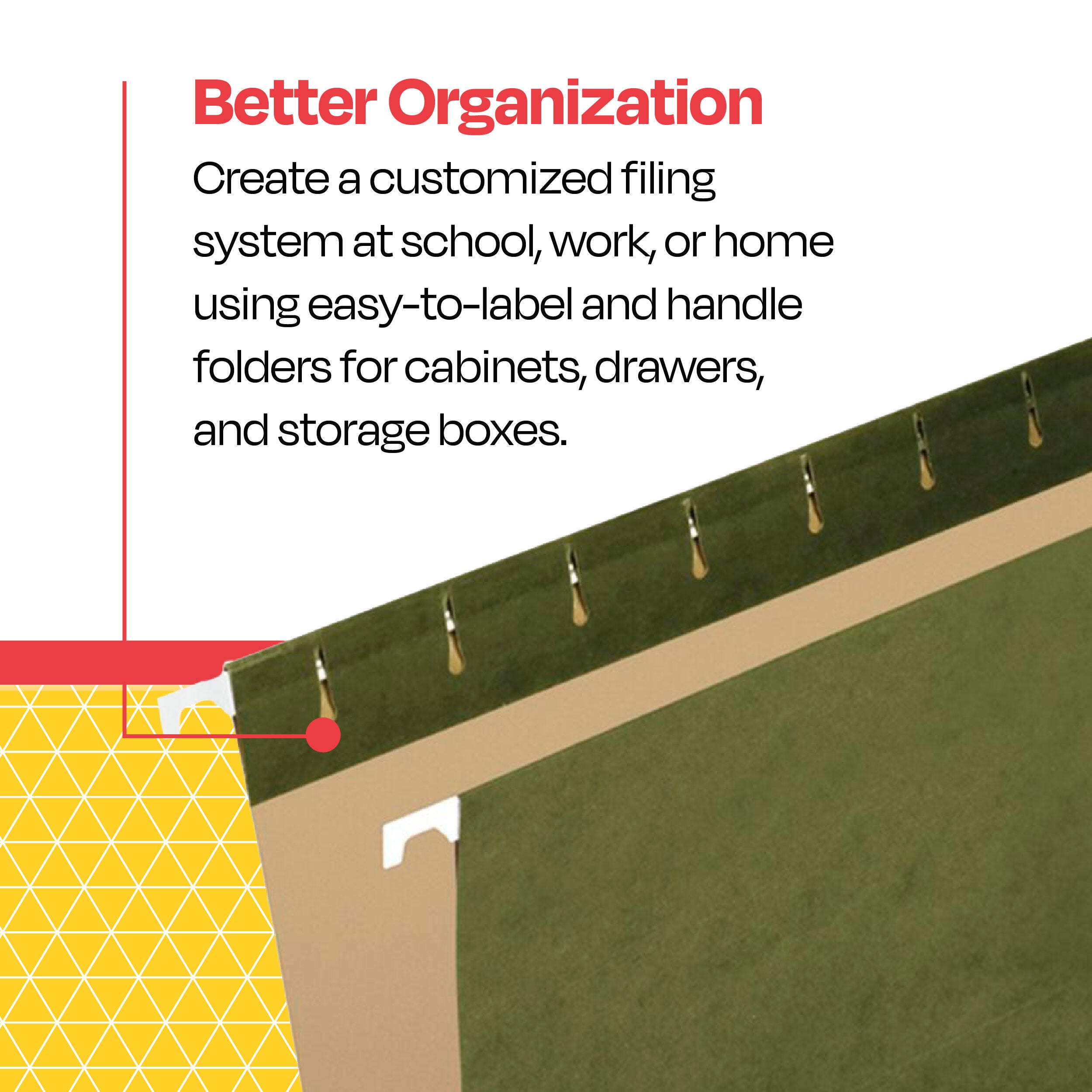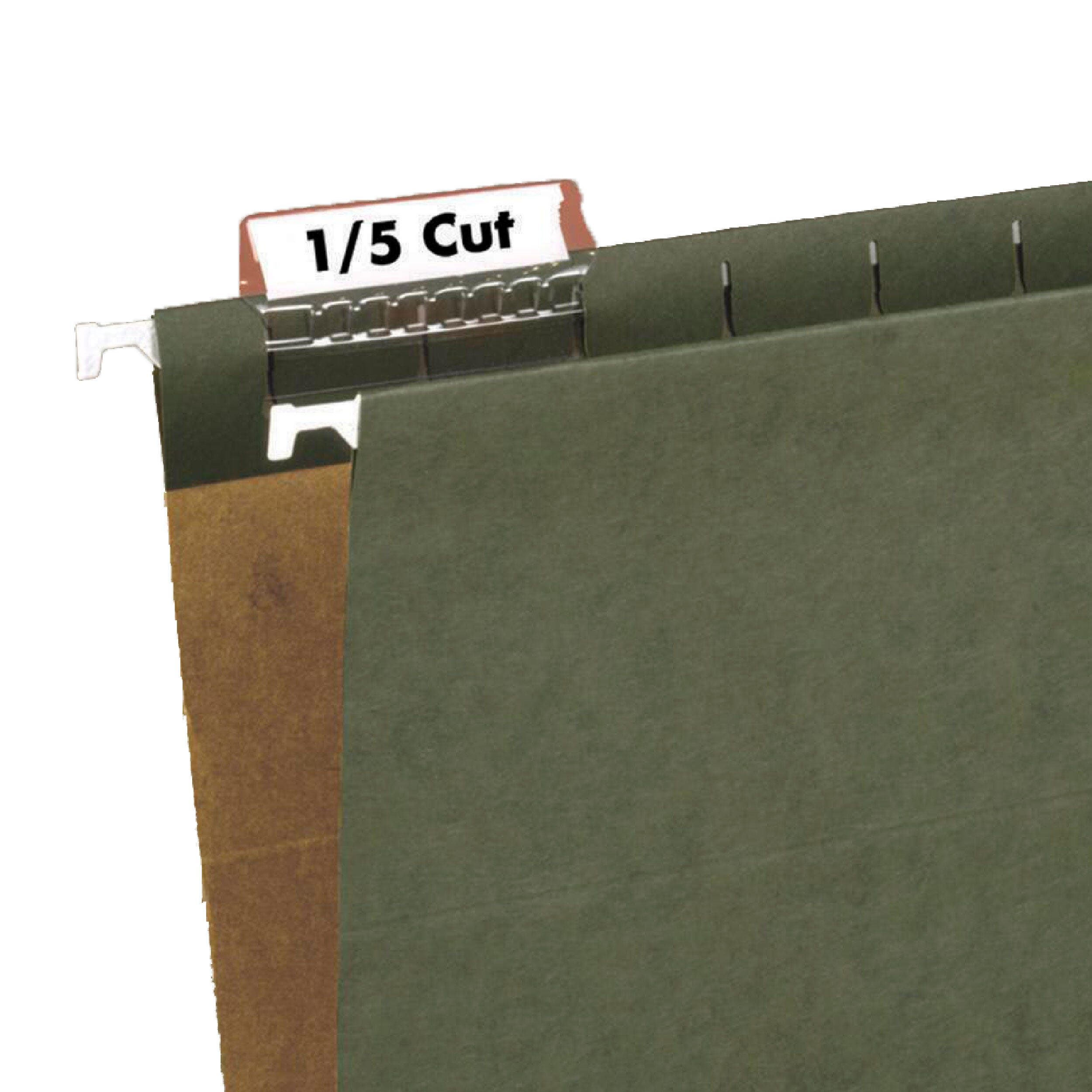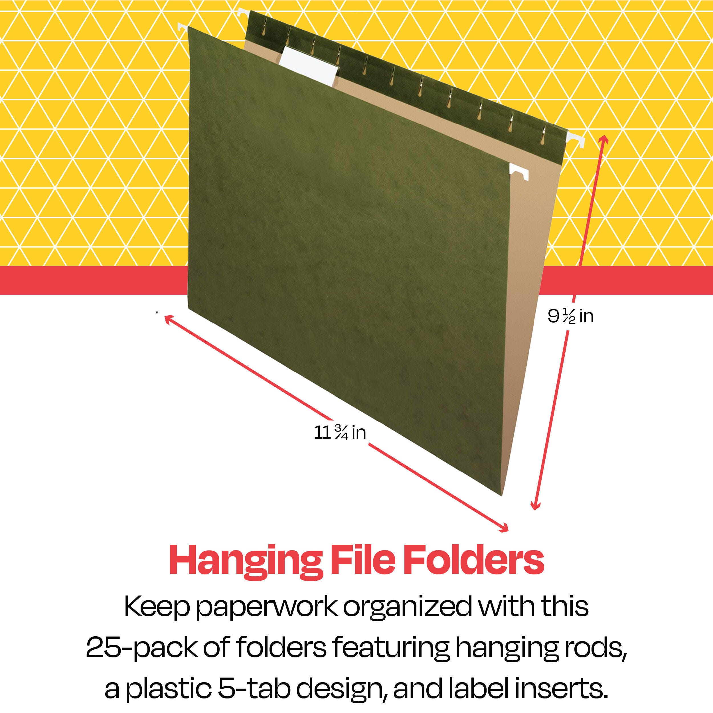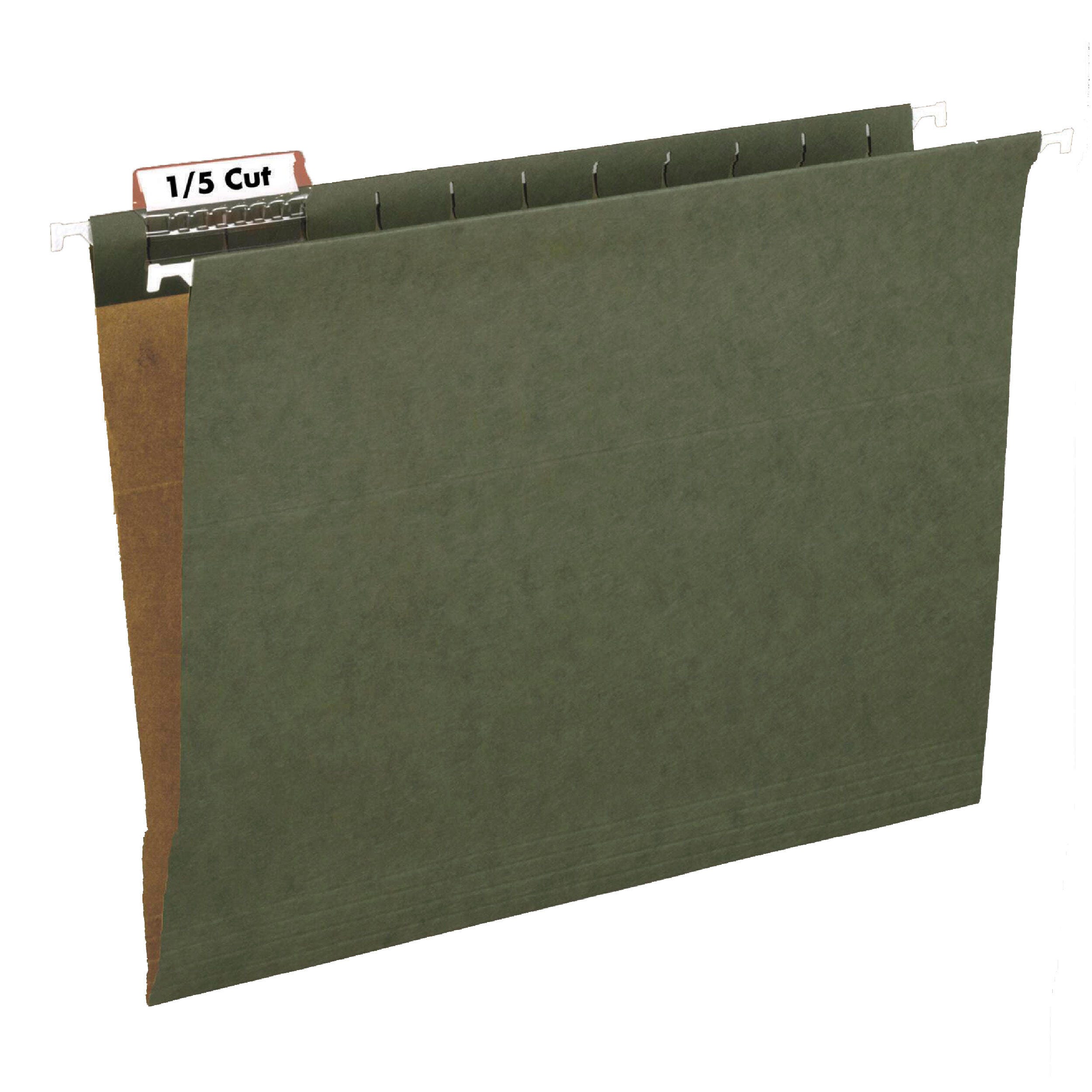 This School Smart hanging file folders letter size set has 5 clear top tabs. The green folders are made of smooth, medium weight stock for long-lasting use in the classroom or office. A sturdy design helps store important paperwork in a vertical file, while the two tones help you identify files quickly and easily. Each reinforced hanging folder has coated hangers for smooth sliding in file cabinets, desk drawers, and storage boxes. Create custom labels with blank inserts and 1/5 cut clear tabs to create your best organization system for letter sized papers.