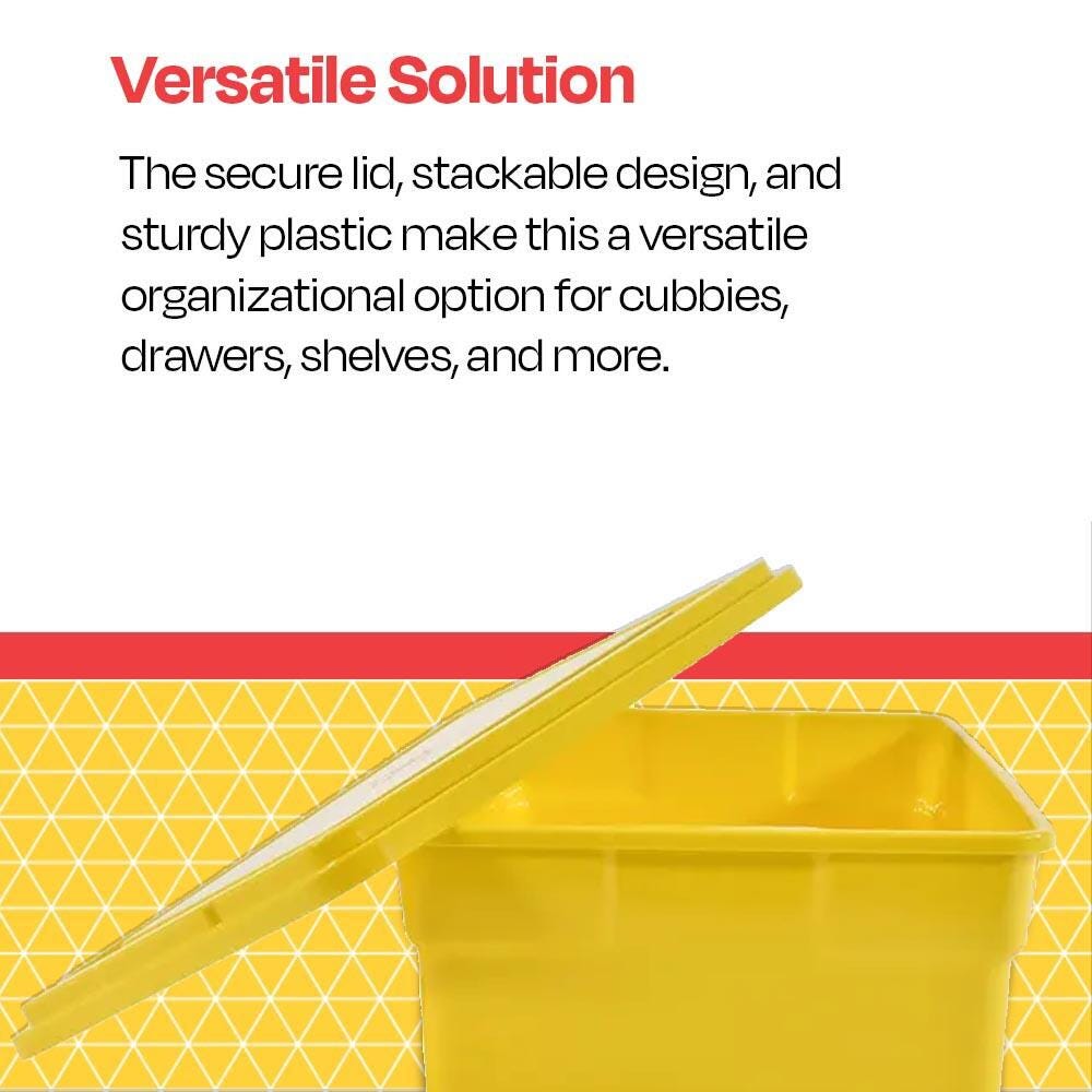 The School Smart yellow plastic cubby bin with lid can store school supplies, arts and crafts materials, toys, blocks, and more. Our versatile, stackable storage container can be used alone, stored within deeper drawers, or compiled into other storage containers. The included lid secures down firmly on top to help prevent young children from taking items out of the storage tub.Features