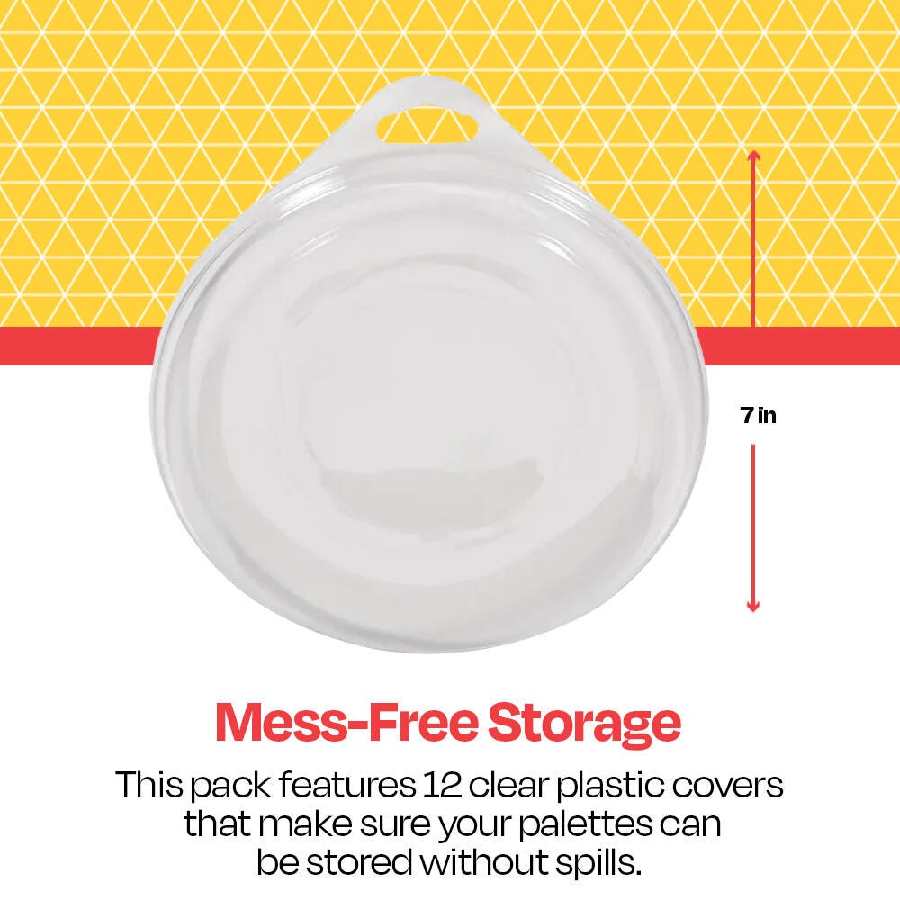 School Smart paint palette tray covers help keep paints moist and ready to use. This 12-pack includes the lids only; palettes are sold separately (please see item 085864). Each paint pan lid measures 7 inches in diameter.