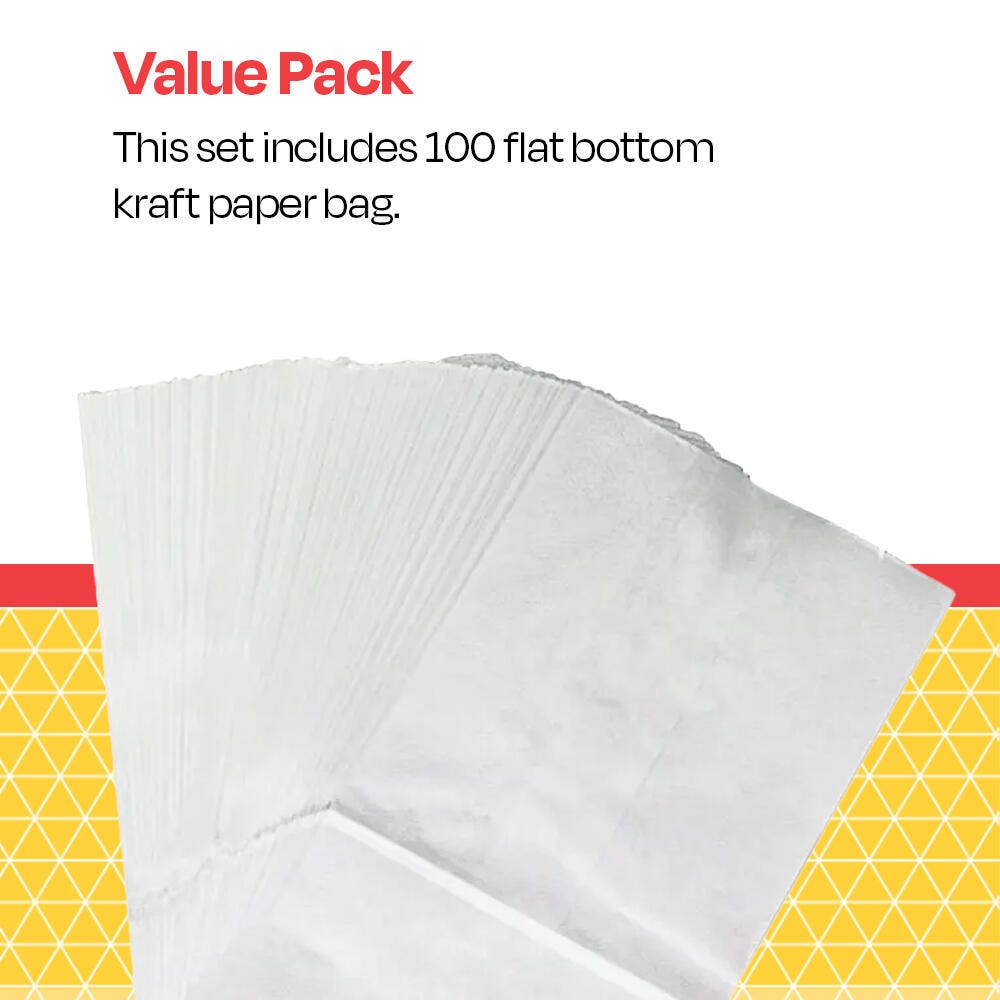 Comes in a 100 pack and each kraft white bag measures 6 x 11 inches