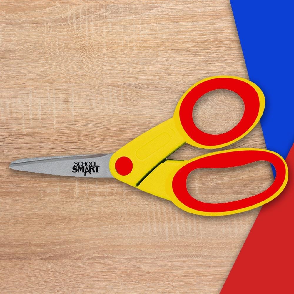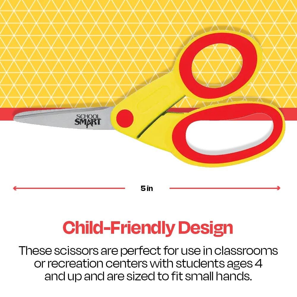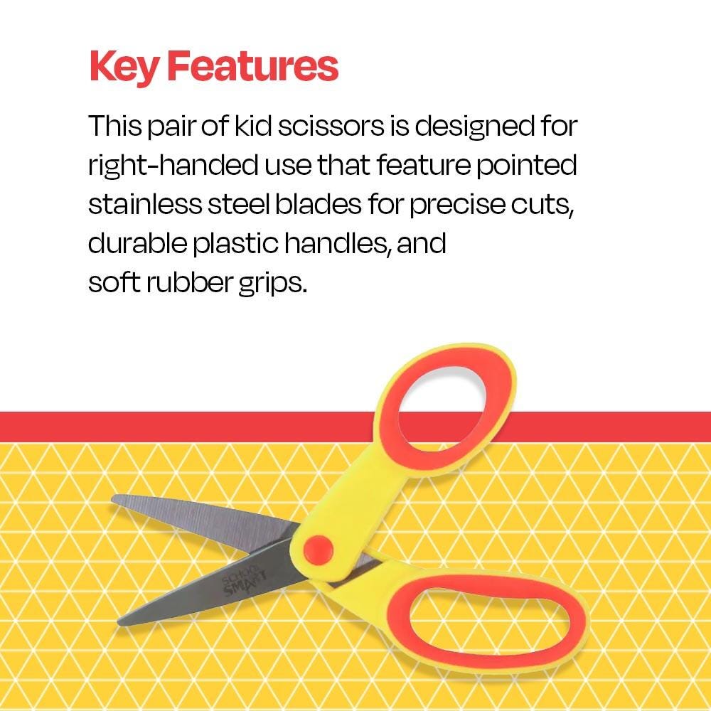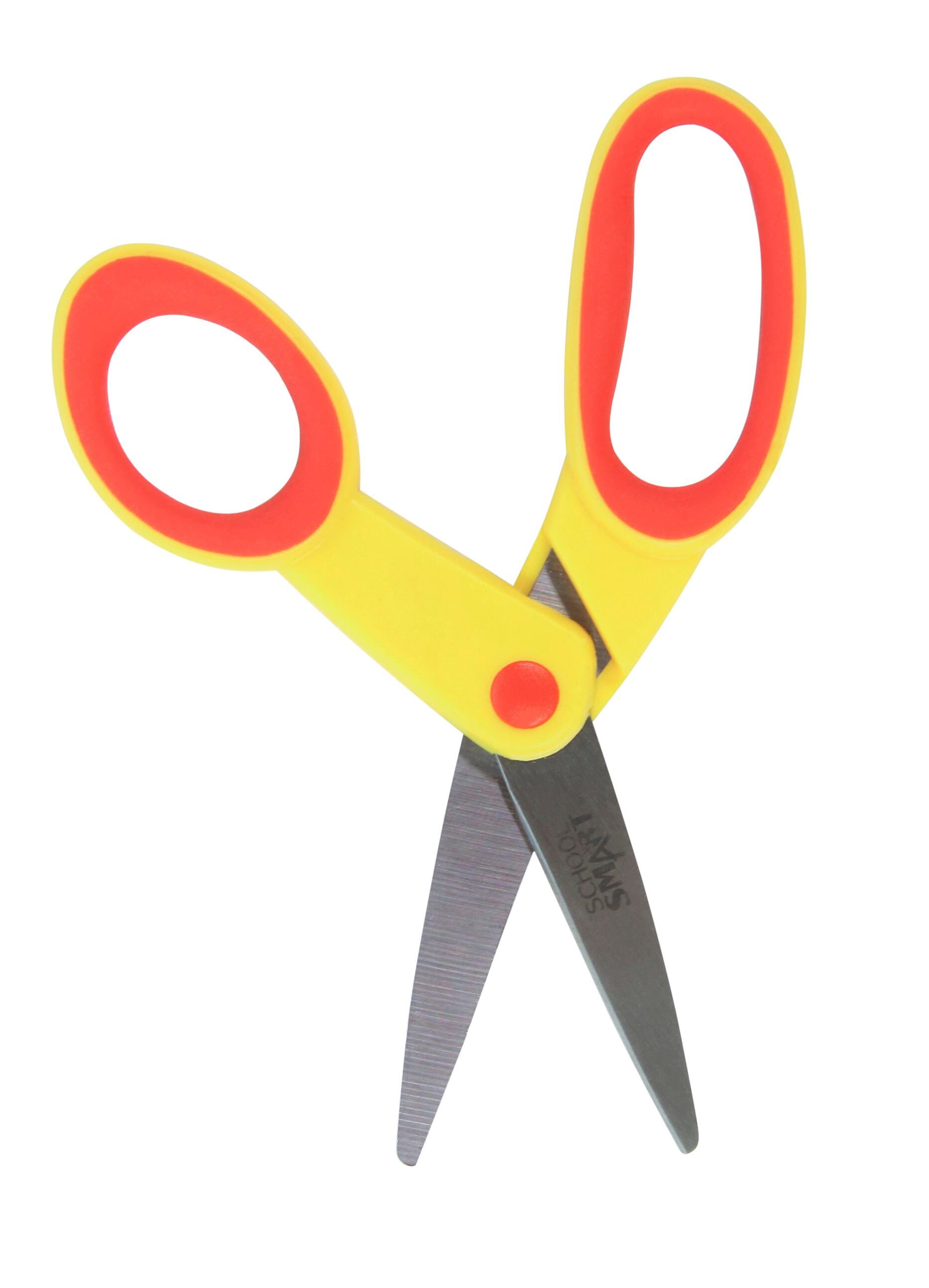 Discover School Smart pointed tip student scissors at an affordable price. Our high-quality, bright-colored children's scissors are perfect for classrooms and recreation centers. The stainless steel blades are molded onto durable plastic handles with soft overmold grips so students can comfortably cut. Appropriate for elementary school and early education, the pointed tip scissor is for ages 4+.