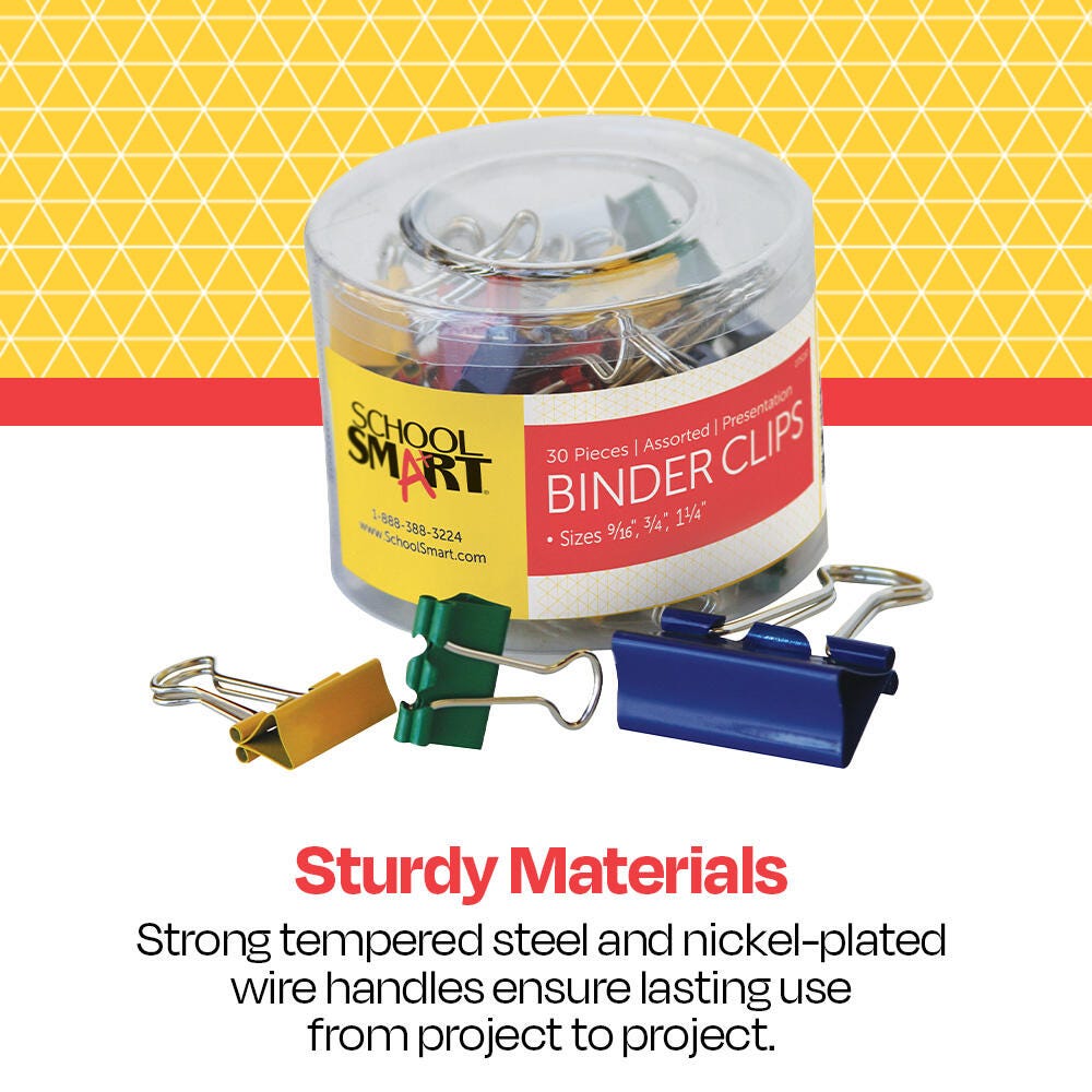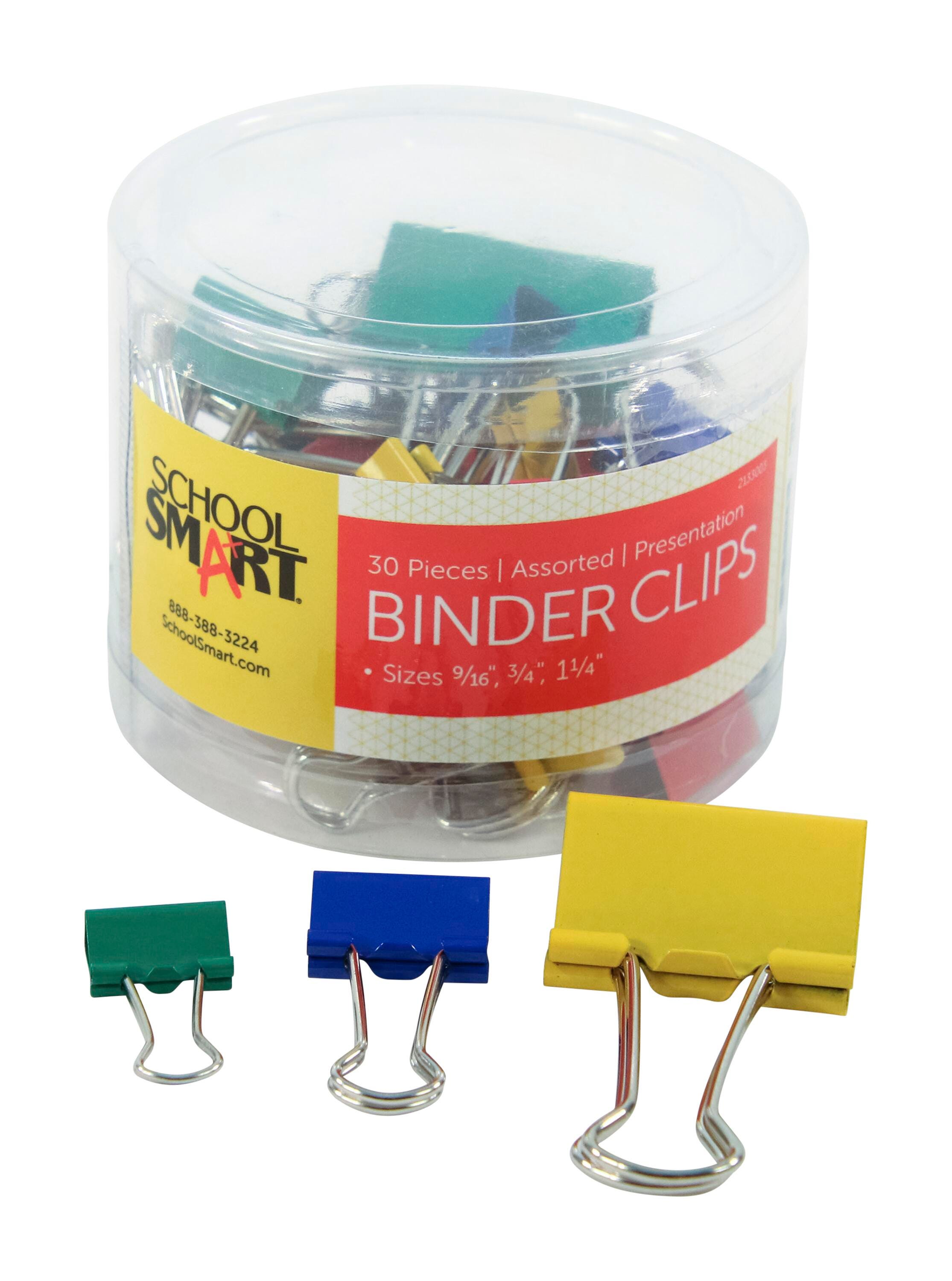 These School Smart Presentation Binder Clips add a touch of color to your projects or reports. This variety pack includes clips with paper holding capacities of 9/16 inches, 3/4 inches, and 1-1/4 inches. These clips are great for color-coding your documents or putting this finishing touch on important presentations. This pack contains 30 binder clips in an assortment of red, blue, green, and yellow.