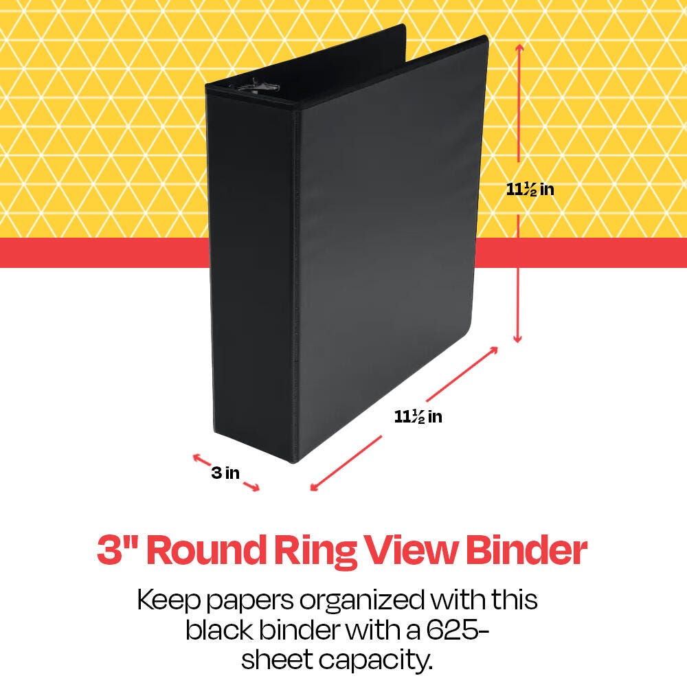 Gather records, paperwork, notes, and other essential papers with the School Smart black 3-inch round ring view binder. Our durable O-ring binder with view pockets has a useful non-glare overlay on the front, back, and spine covers to allow you to insert custom labels or individual sheets for easy viewability and access. Cover pockets on the large clear-view binder also prevent the transfer of ink from printed materials. The O-ring mechanisms are O-shaped and easy to open and close, so you can organize and store important sheets of paper in your 3-ring view binder. Made of polypropylene, the sturdy binder also has two deep inner pockets to hold loose sheets of paper. This O-ring file has a 500-sheet capacity, and the entire black binder measures 11-1/2 x 11-1/2 inches.Features