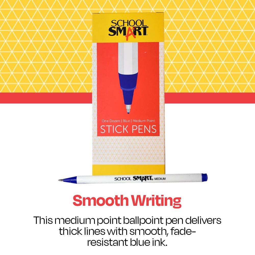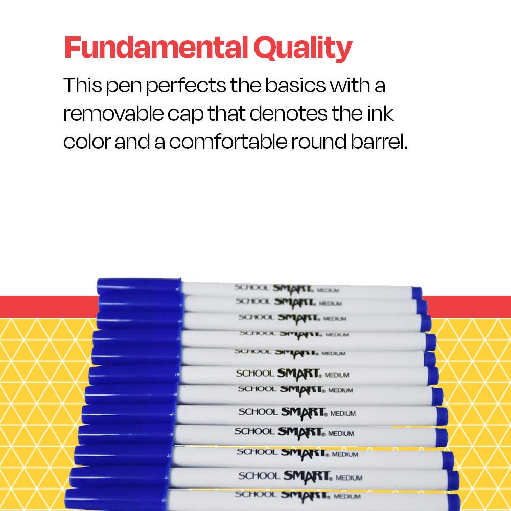 School Smart blue round stick pens with caps give you the basics at an affordable price. Ideal for daily use, the classic pen is great for taking notes, making lists, creating lesson plans, and more. A blue cap matches the color of the ink for easy identification and the closeable design makes it easy to travel with a pen in your pocket or bag. This medium tip pen offers a smooth writing experience wherever you go, whether it’s the classroom, office, or home.