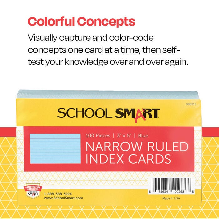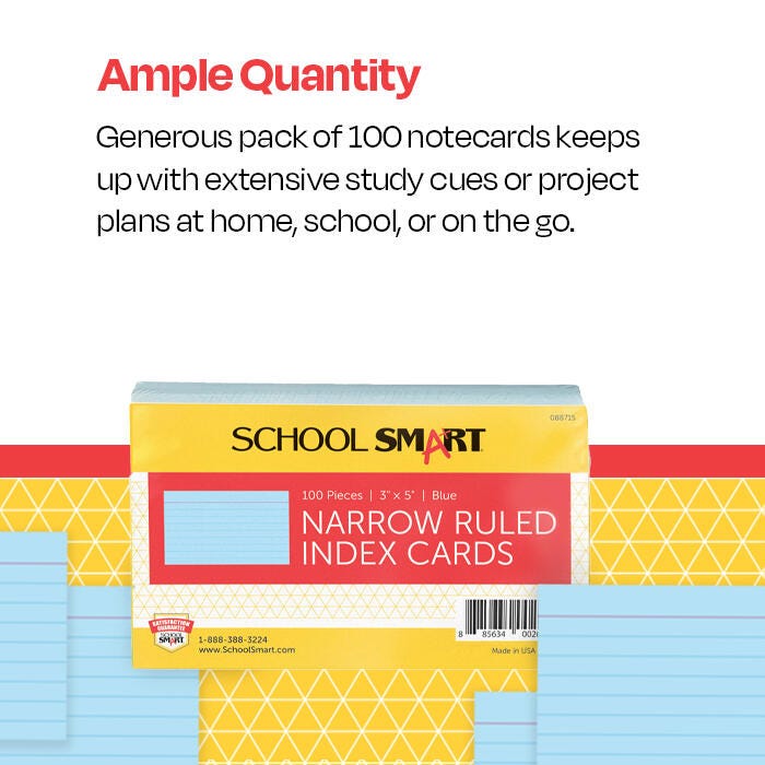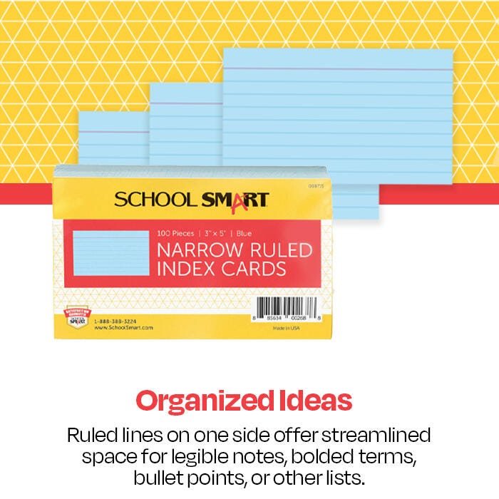 Whether you're giving the presentation of the year or you're shifting your study mode into high gear, School Smart has the tools you need to succeed. Ruled index cards made from 91 lb. index stock are ideal for creating flashcards that aid in memorization and the absorption of knowledge. Cards measure 3 x 5 inches, perfect size to keep with you whether in your pocket, backpack, or in your binder! Sold as a pack of 100 index cards.