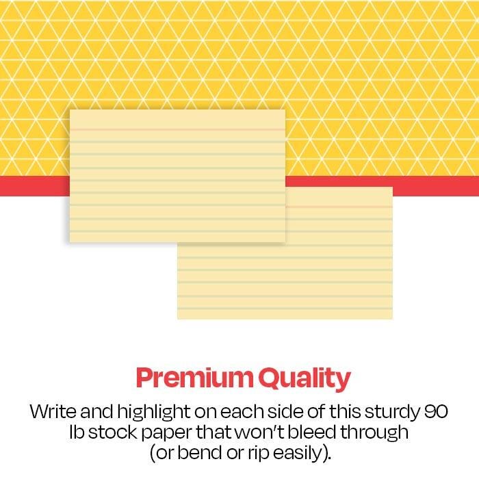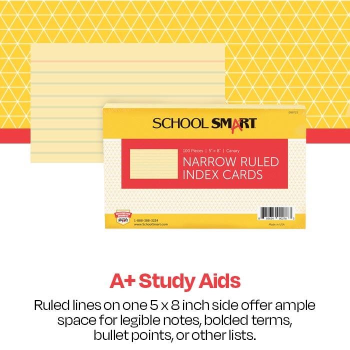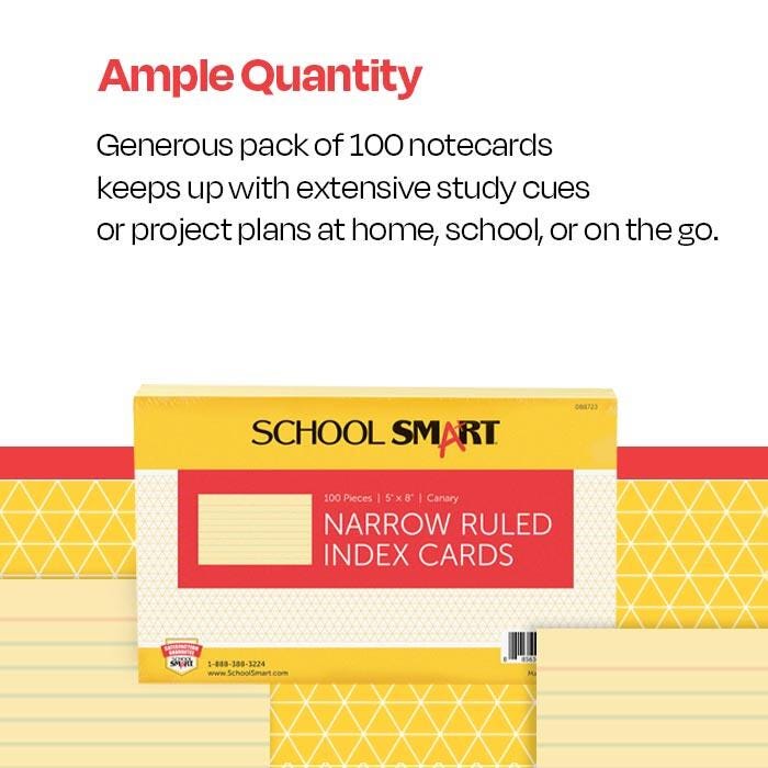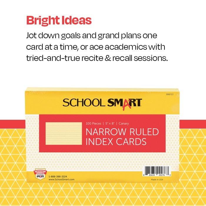 Kick your study routine up a notch with the help of classic canary index cards from School Smart. Ruled index cards made from 91 lb. index stock are ideal for creating flashcards that aid memorization and speech preparation. The cards measure 5 x 8 inches with ample space for notes, diagrams, and anything in between while also remaining portable to bring on the go. Sold as a pack of 100 index cards.