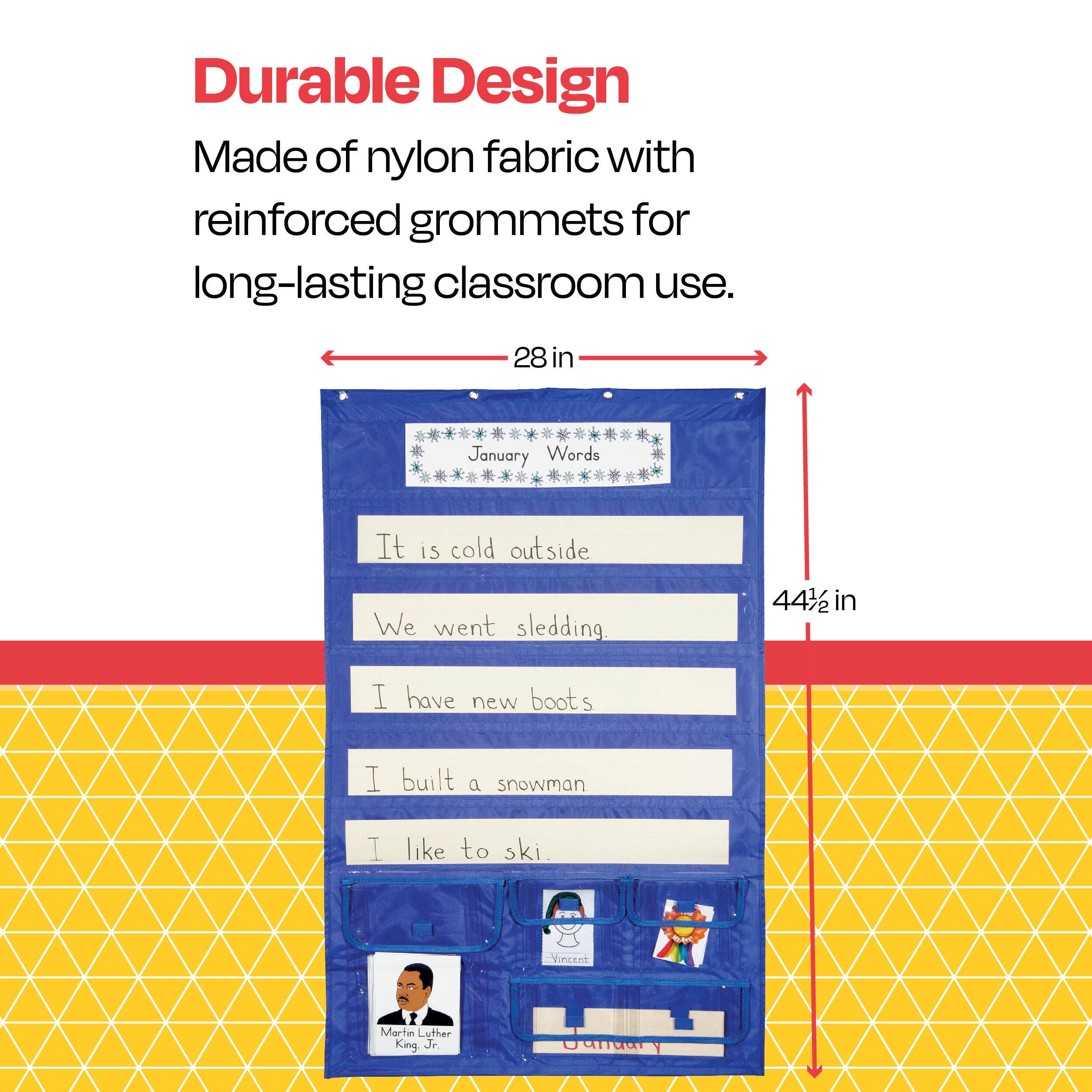 • Durable metal grommets allow for reliable hanging of the calendar pocket chart