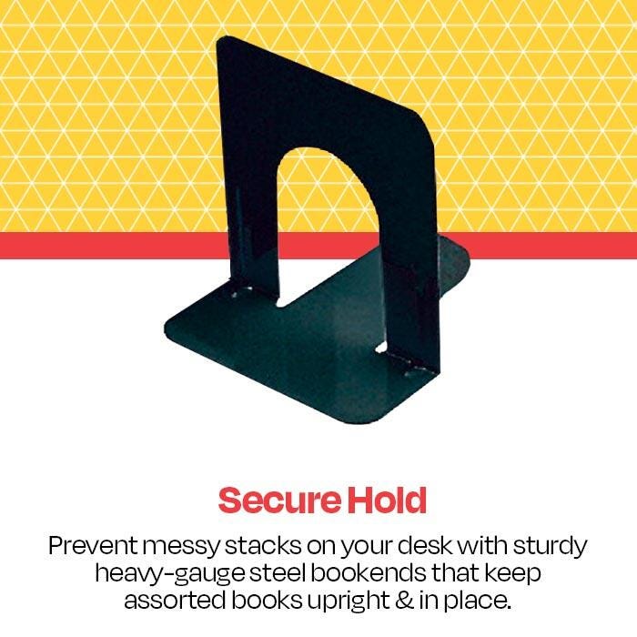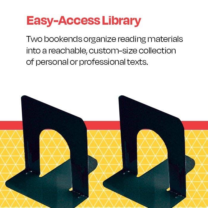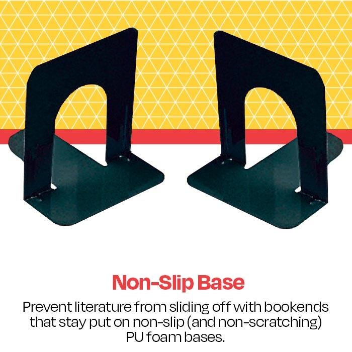 School Smart Non-Skid Steel Bookends in black support your books in a sleek, modern style. Measuring 5-3/4 inches x 6 inches, these bookends are used for average books. They offer an ideal way to keep shelves tidy and are made of heavy-gauge steel for a secure hold. Smooth coined edges on both the inner and outer arcs offer extra safety. Polyurethane foam on the base provides a non-skid feature that also prevents scratching on surfaces. Sold as a set of two bookends.