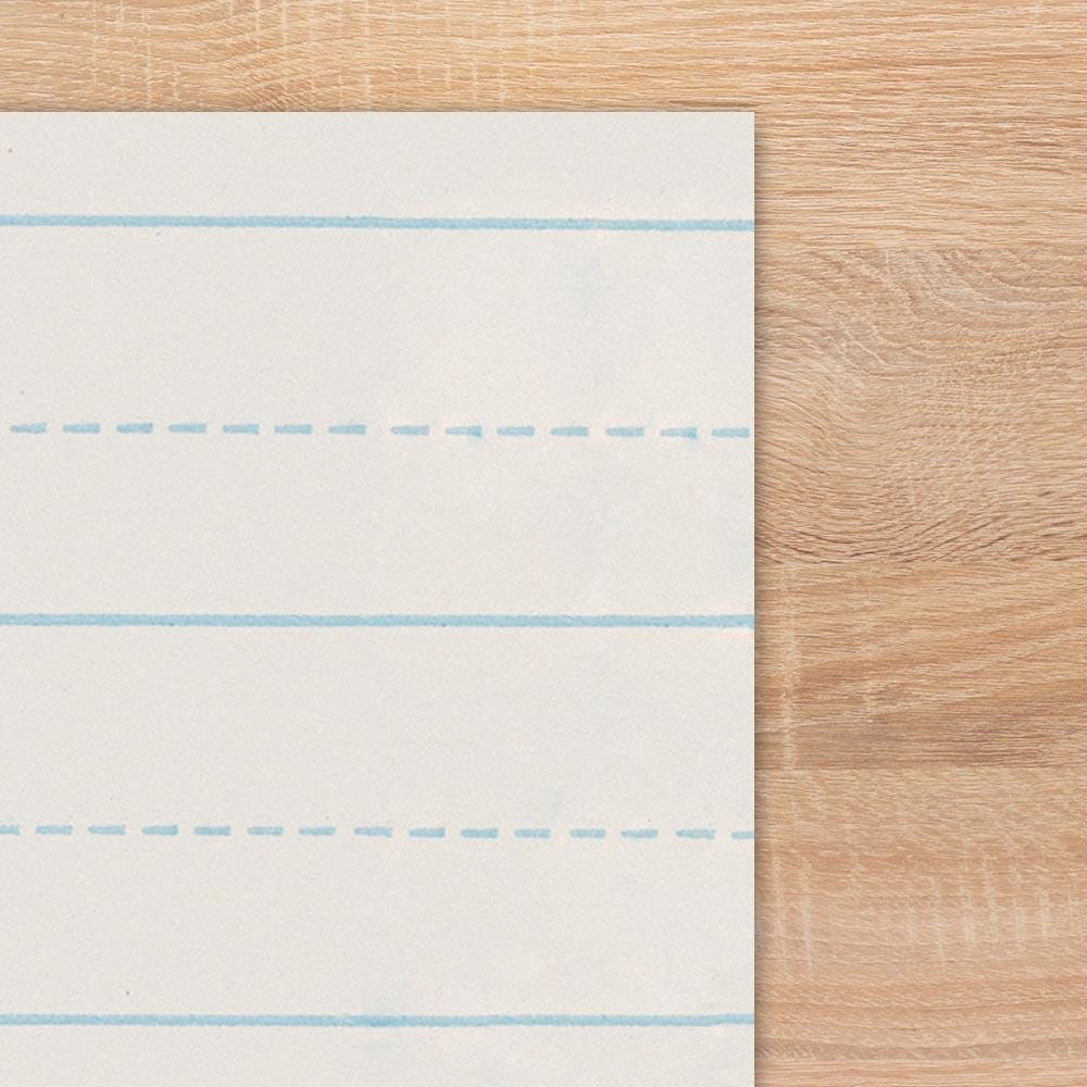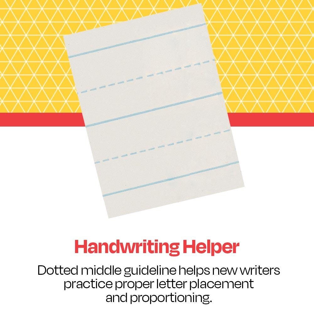 The School Smart Picture Story Alternate Ruled Paper (measuring 18 x 12 inches) has a 3/4 inch ruling with a 3/8 inch broken midline. The upper section of the paper has an approximate 6-inch space left blank for pictures and self-expression. Sold as 500 sheets per pack. Recommended for Grades K through 6.