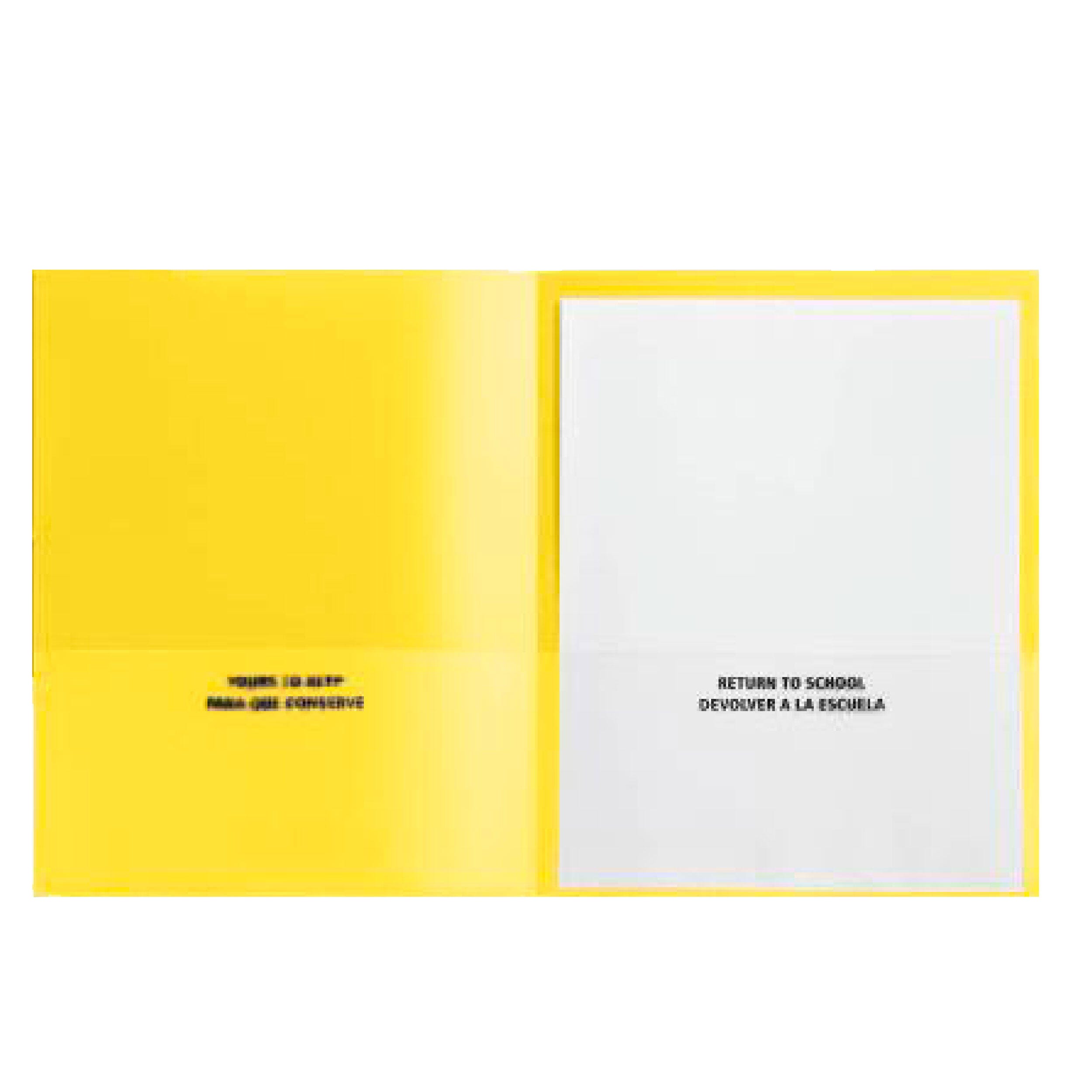 School Smart yellow take home folders provide maximum protection and a fun, sleek appearance. The construction is made of durable grained polypropylene with an embossed, clear border for viewing and placing your most important documents or notecards. Our 2-pocket folders with clear border slips include a left pocket with business card holder slot and "Return to School" bilingual text indications. Each plastic take home folder for students holds up to 100 sheets of paper.