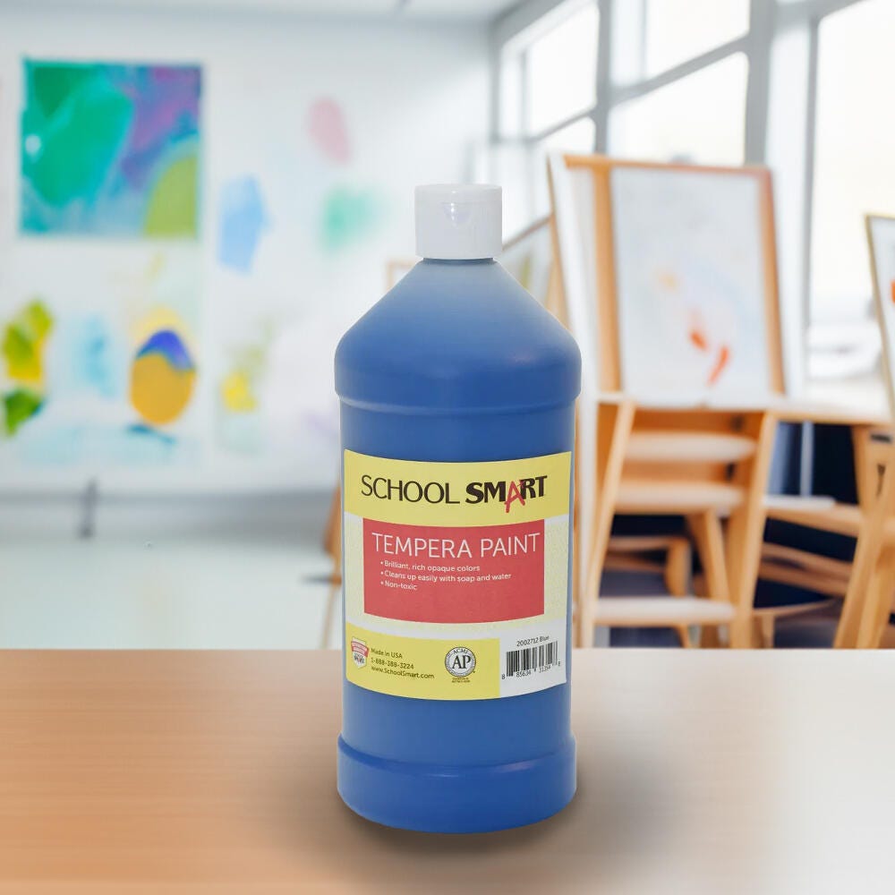 This School Smart traditional tempera paint in blue comes in an economical value size bottle. Our brilliant and rich opaque paint color offers students endless creativity and color blending possibilities. The non-toxic tempera paint cleans up easily with soap and water and won’t chip, flake, or crack when dry. The blue tempera paint is great for classrooms, schools, art classes, and after school programs.