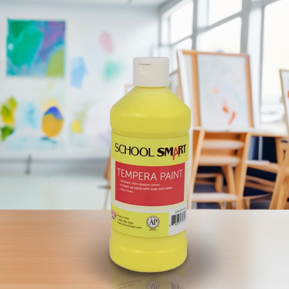 This School Smart traditional tempera paint comes in a yellow color. The bottle of yellow tempera paint is great for classrooms, schools, art classes, and after school programs. Our brilliant and rich opaque paint color offers students endless creativity and color blending possibilities. The non-toxic tempera paint cleans up easily with soap and water and won’t chip, flake, or crack when dry.