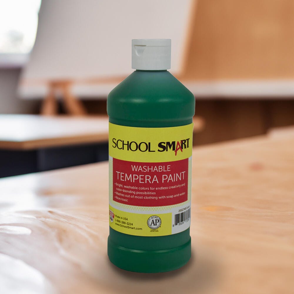 The School Smart washable tempera paint comes in a green color. This bottle of green tempera paint is great for classrooms, schools, art classes, and after school programs. The brilliant and rich opaque paint color offers students endless creativity and color blending possibilities. Our non-toxic tempera paint cleans up easily with soap and water and won't chip, flake, or crack when dry.Features