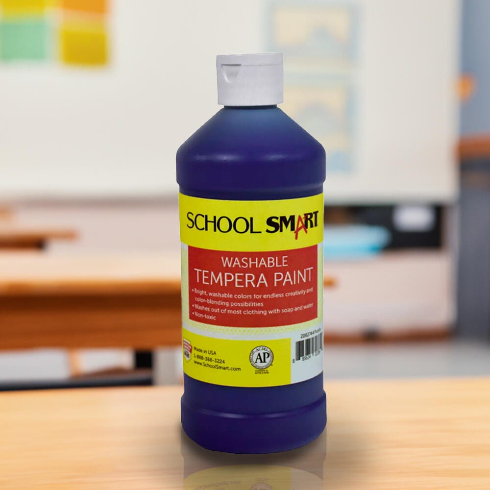 The School Smart washable tempera paint comes in a purple color. This bottle of purple tempera paint is great for classrooms, schools, art classes, and after school programs. The brilliant and rich opaque paint color offers students endless creativity and color blending possibilities. Our non-toxic tempera paint cleans up easily with soap and water and won't chip, flake, or crack when dry.