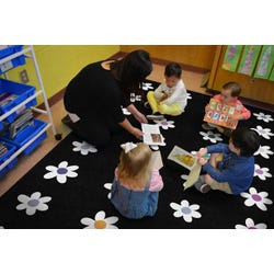 This classroom rug is designed to be timelessly chic with its black and white design, with a pop of fun with dainty daisies. Can be used as a fashionable area rug to enhance your space or a functional seating carpet that's durable, soft, and perfect for years of storytime and circletime. For a fashionable flower rug that's both subtle and timeless, look no further. This rectangle carpet is available in a variety of sizes to best match your space. Please select the appropriate floor covering size when ordering.Features