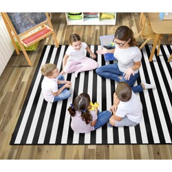 Classic black-and-white stripes found in this classroom carpet is the versatile design solution for your space. These stripes can match with bright and colorful designs typically found in educational environments like the classroom, playroom, childcare center, or preschool. They can add a pop of fun to modern or typical Montessori design without clashing. All while being durable to withstand the dynamic demands of the high-energy children who frequent your space. No matter your aesthetic, this elevated classic will polish any room where it's placed. This rectangular rug is available in several sizes. Please select the size that fits your space best when ordering.Features