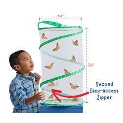Insect Lore’s Butterfly Pavilion Prepaid Kit is ideal for grades PreK to 3. Over three weeks, observe and learn as TEN tiny caterpillars eat and grow, transform into chrysalides, and then emerge as beautiful Painted Lady butterflies. Feed and enjoy your butterflies for a few days, then let them go to pollinate our precious world. The reusable pavilion habitat measures 2 feet tall and is an ideal environment for young entomologists to learn all about the life cycle of butterflies. When you're ready to start, simply redeem your prepaid voucher online to receive 10 baby live caterpillars and all their food. Record their changes in your entomologist STEM activity journal and learn through its suggested immersive activities! Available in the continental U.S. and Alaska only. Contains small parts, not for children under 3 years of age. Check the temperature! It’s best to do this project when daytime temperatures in your area are between 55-85 degrees Fahrenheit.