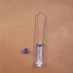 Frey Scientific Hanging Boyle's Law Unit consists of a specially modified 10 milliliter plastic syringe with a metal loop fastened to the plunger end. Masses of all sizes can easily be suspended from the loop. This convenient, low-cost design gives precise data without the special care required with the use of mercury apparatus. Apparatus clearly demonstrates all tested gases conform to the pressure-volume constant and the various elastic qualities of gases. A pinchcock and quantity of lubricant are included.Features