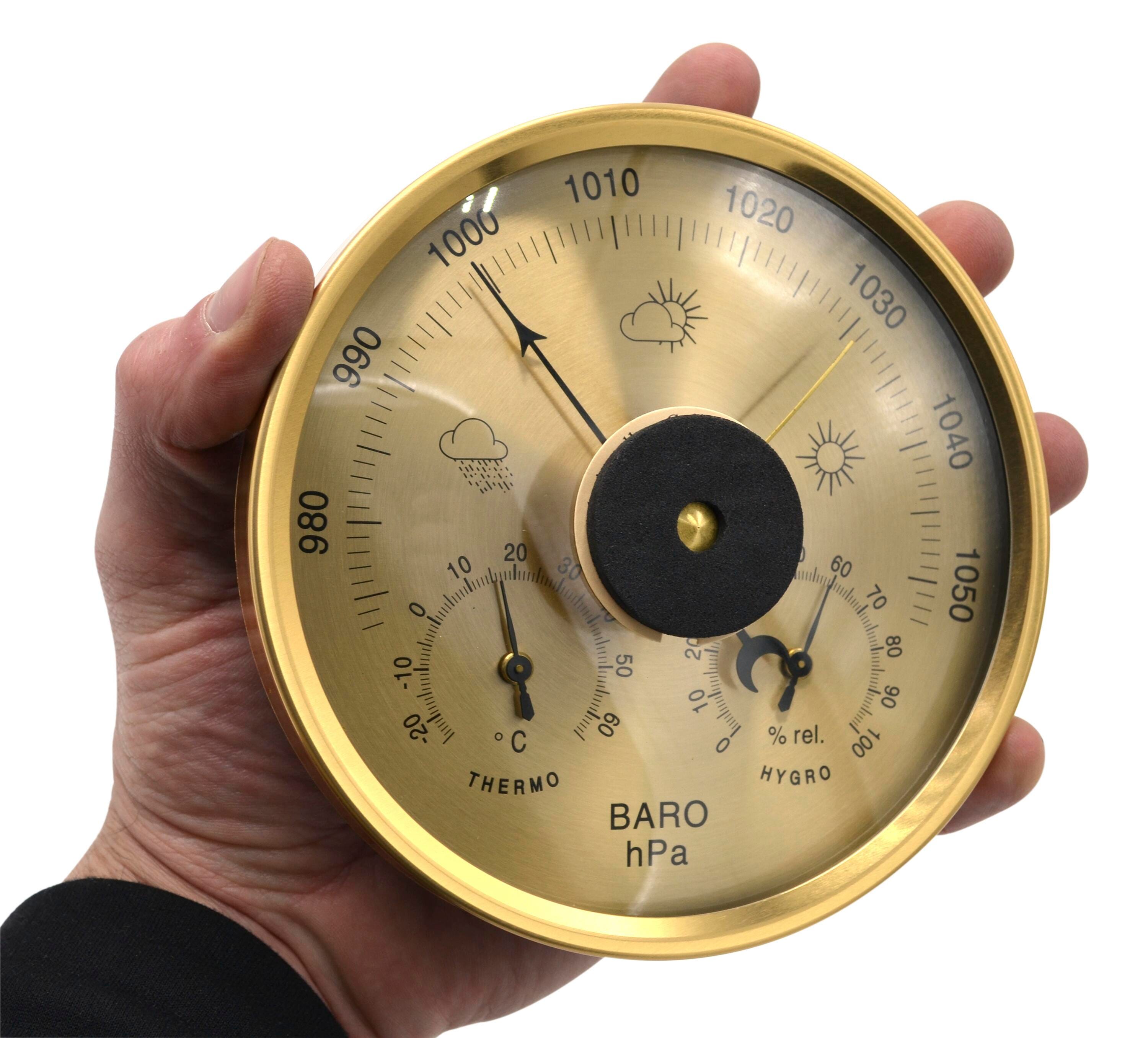 This economically priced 3 in 1 weather station provides convenient weather data in a simple yet classy manner. Round design measures temperature (Celsius), air pressure, and air moisture levels all at the same time, in easy-to-read facing. Diameter of tool measures approximately 5-1/10 inches.
