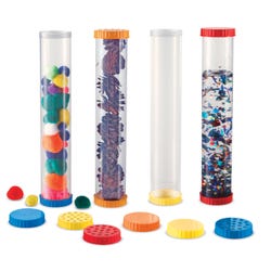 Develop students' senses and encourage science exploration with this set of 4 sturdy, clear Sensory Tubes from Learning Resources. Each tube has dual openings and the set includes 8 solid lids and 4 vented lids in blue, yellow, and orange colors. These vented lids let children explore their sense of smell or secure small creatures for observation. The lids easily twist off and on, and the solid lids hold liquid securely inside. Each tube measures 12 H x 2 L inches in diameter. For ages 2 and up.Features
