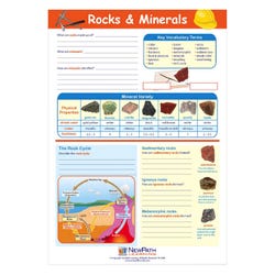 Complete, easy-to-use and engaging, the Rocks & Minerals Learning Center is ideal for the instruction and review of this key, standards-based concept. Designed for either teacher-directed instruction or independent use by groups of 2 to 4 students, the Learning Center provides complete, leveled coverage of this curriculum-aligned topic, making it perfect for differentiated instruction. To use, the students first work individually or in pairs using the 4 laminated Visual Learning Guides provided on the topic. The guide provides a graphic, easy-to-follow overview of the concept; “Write-On/Wipe-Off” activities and graphic organizers; and a set of guiding, assessment review questions. They then form in a group to play the Curriculum Mastery Game included for cooperative or competitive review and reinforcement of the concepts. Packaged in a durable pouch, the Learning Center is a ready-to-use resource for the classroom, after school and summer school programs or at home for test preparation, practice and review! Grades 3 - 5.Features
