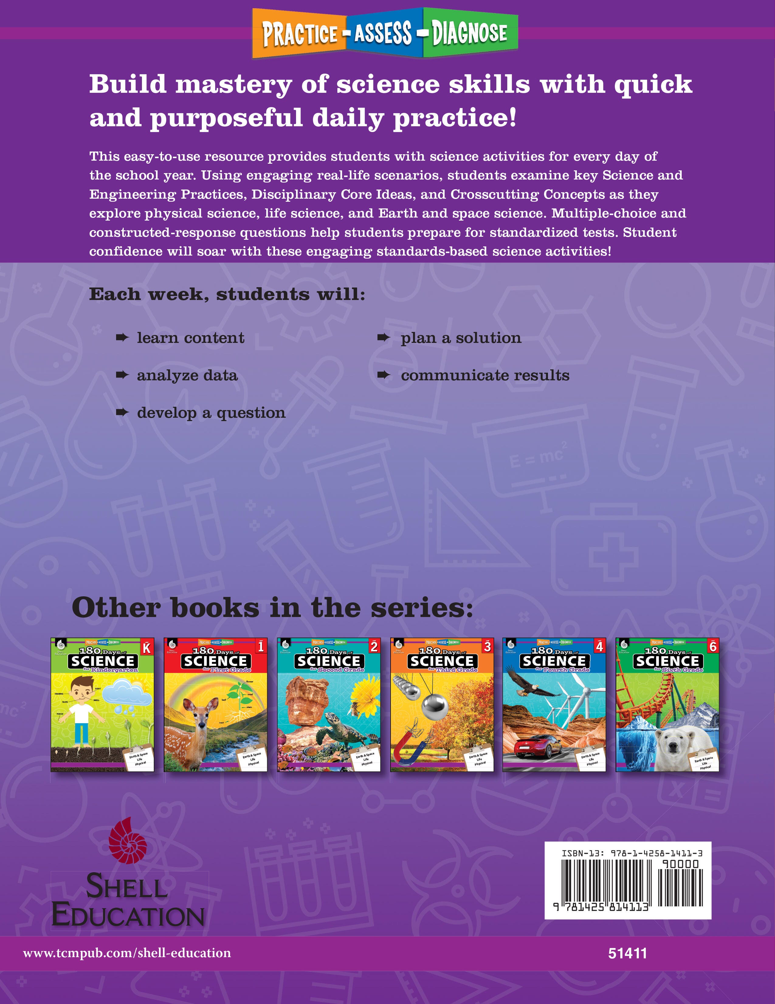 180 Days™: Science for Fourth Grade provides students with the skills they need to think like scientists! This invaluable classroom book provides teachers with weekly science units that build students' content-area literacy and are easy to incorporate into the classroom. Students will analyze and evaluate scientific data and scenarios, improve their understanding of science and engineering practices, answer constructed-response questions, and increase their higher-order thinking skills. Each week covers a particular topic within one of three science disciplines: life science, physical science, and Earth and space science. Aligned to Next Generation Science Standards (NGSS) and state standards, this resource includes digital materials.Features