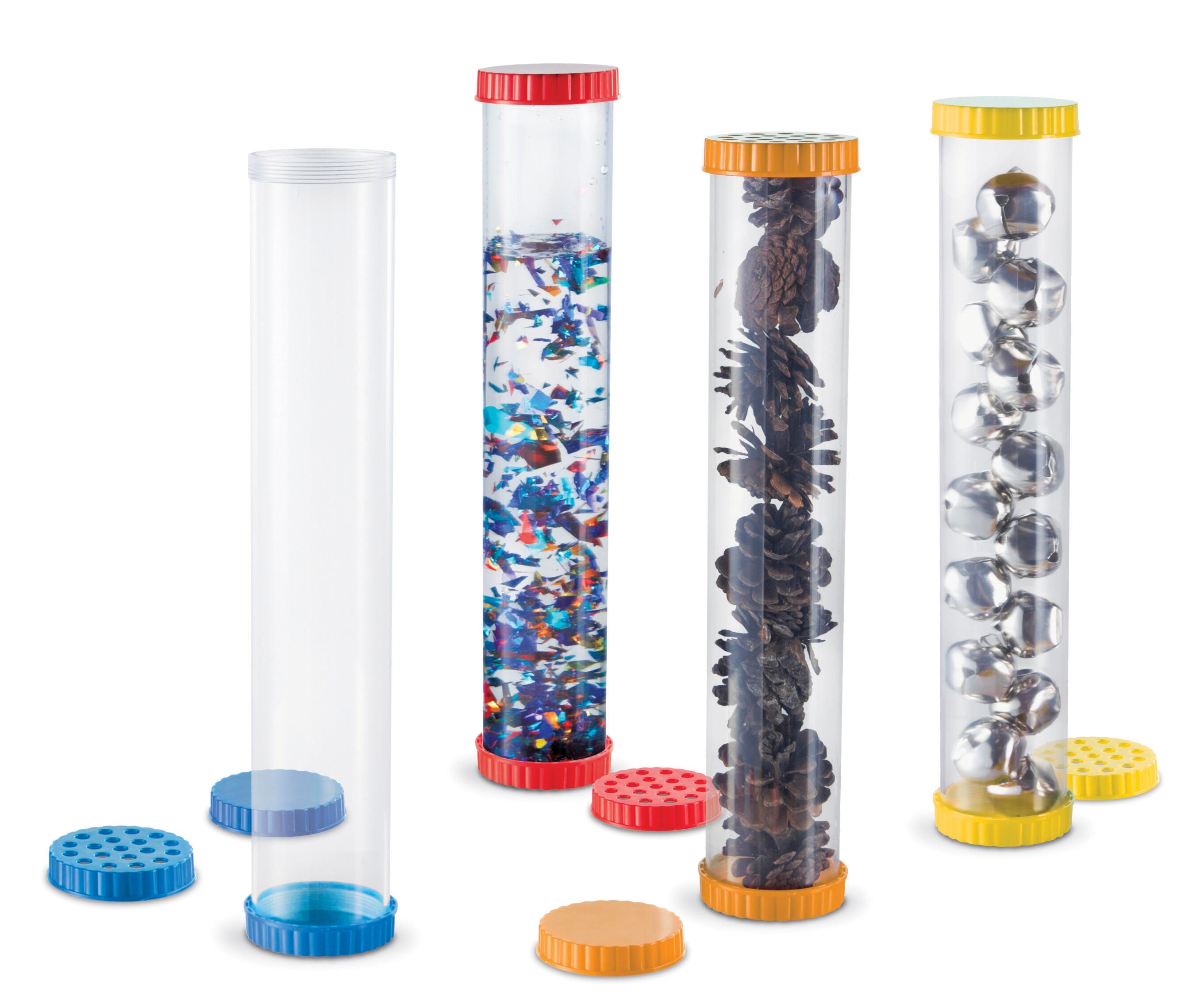 Develop students' senses and encourage science exploration with this set of 4 sturdy, clear Sensory Tubes from Learning Resources. Each tube has dual openings and the set includes 8 solid lids and 4 vented lids in blue, yellow, and orange colors. These vented lids let children explore their sense of smell or secure small creatures for observation. The lids easily twist off and on, and the solid lids hold liquid securely inside. Each tube measures 12 H x 2 L inches in diameter. For ages 2 and up.Features