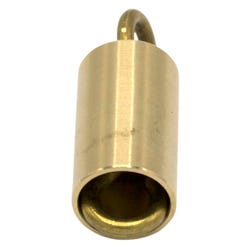 Hooked weight is made of solid brass with weight of 20 grams (0.044 pounds). 1.10 pounds). Hook is free to move and hooks on both sides for additional weights to be connected. Cylindrical weight is natural brass color with stamped identifier. Diameter is 15 millimeters (approximately 3/5 inches); height is 26 millimeters (approximately 1 inch). This weight has a bored hole through the weight to allow for the moving double hook to sit flat if need be.