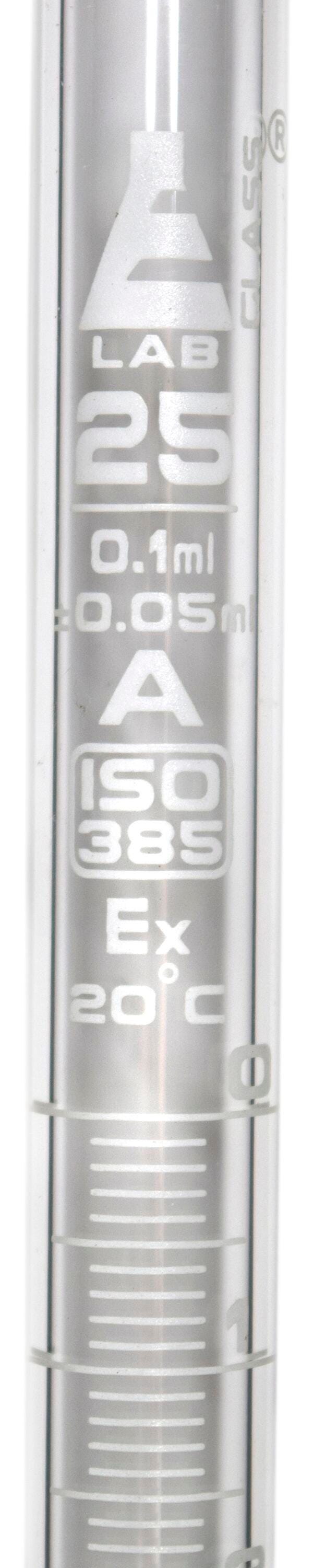 These high quality borosilicate burettes from Eisco Labs are straight bore with interchangeable PTFE key stopcocks. Accuracy is per ISO 385, DIN 12709. White graduations. Capacity 25ml; Sub. Div. 0.10ml; Tolerance ± 0.05ml.