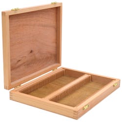 This Wooden Slide Box is built to store up to 100 standard sized (75 x 25 millimeter, or approximately 3 x 1 inch) microscope slides. The heavy duty wooden planks act as pressure plates to secure slides better than some plastic versions. It's durable wooden shell is fastened with a metal hinge for a reliable closure in between uses.