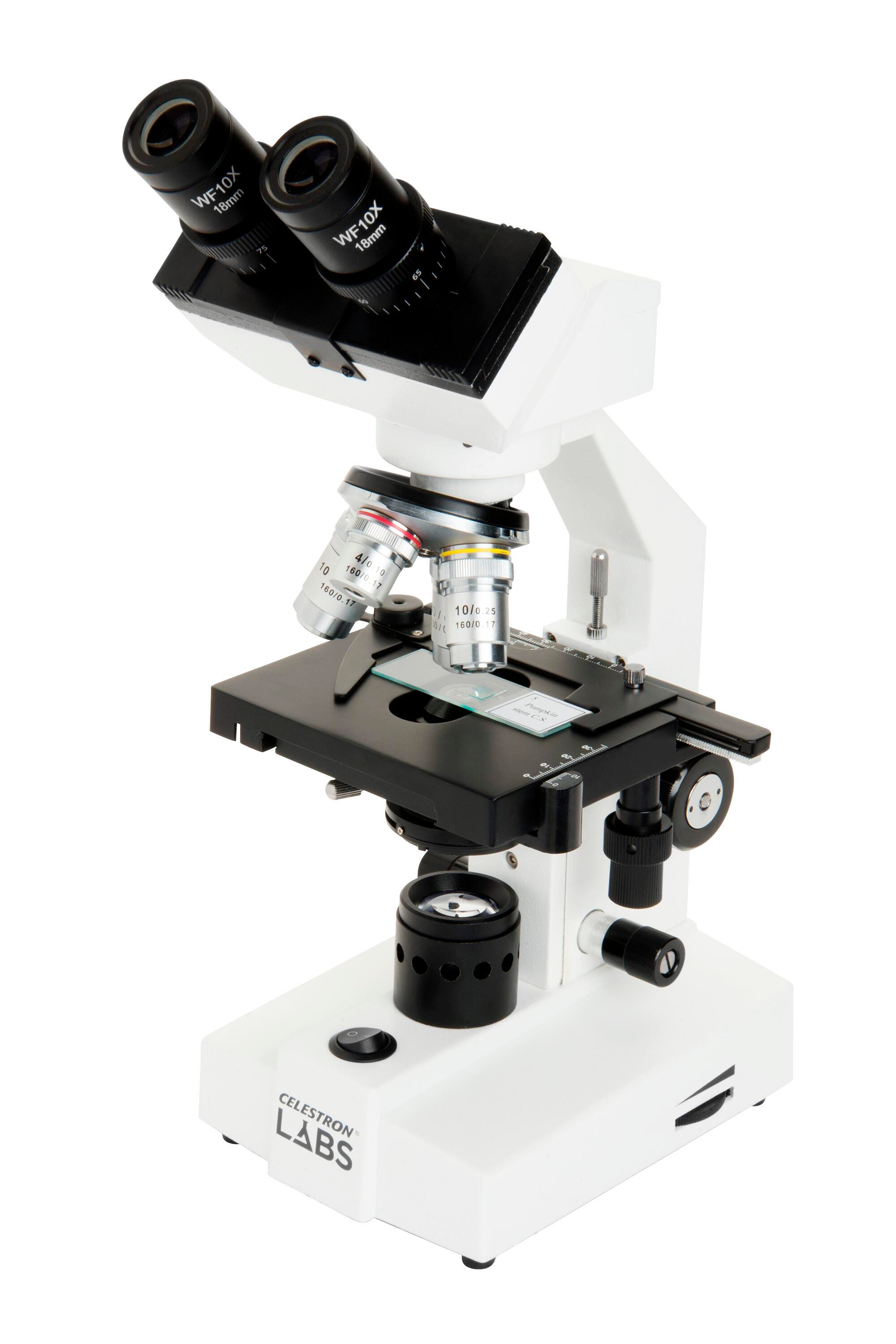 The Celestron Labs CB2000CF Binocular Compound Microscope offers all the advanced features you’re looking for at an economical price. With 10x and 20x eyepieces and 4 included objective lenses (4x, 10x, 40x and 100x), you’ll achieve magnification ranging from 40x to 2000x. Strong and stable thanks to its all-metal construction, this microscope features a fully adjustable, mechanical stage so you can easily center your specimen slides. Improve the quality of your magnified images with the included 3 colored filters. The 10 included prepared slides guarantee exciting discoveries right out of the box. The N 1.25 Abbe condenser with iris diaphragm concentrates and focuses the lower illumination for enhanced viewing making the CB2000CF an excellent tool for labs, schools, scientific research and more.Features