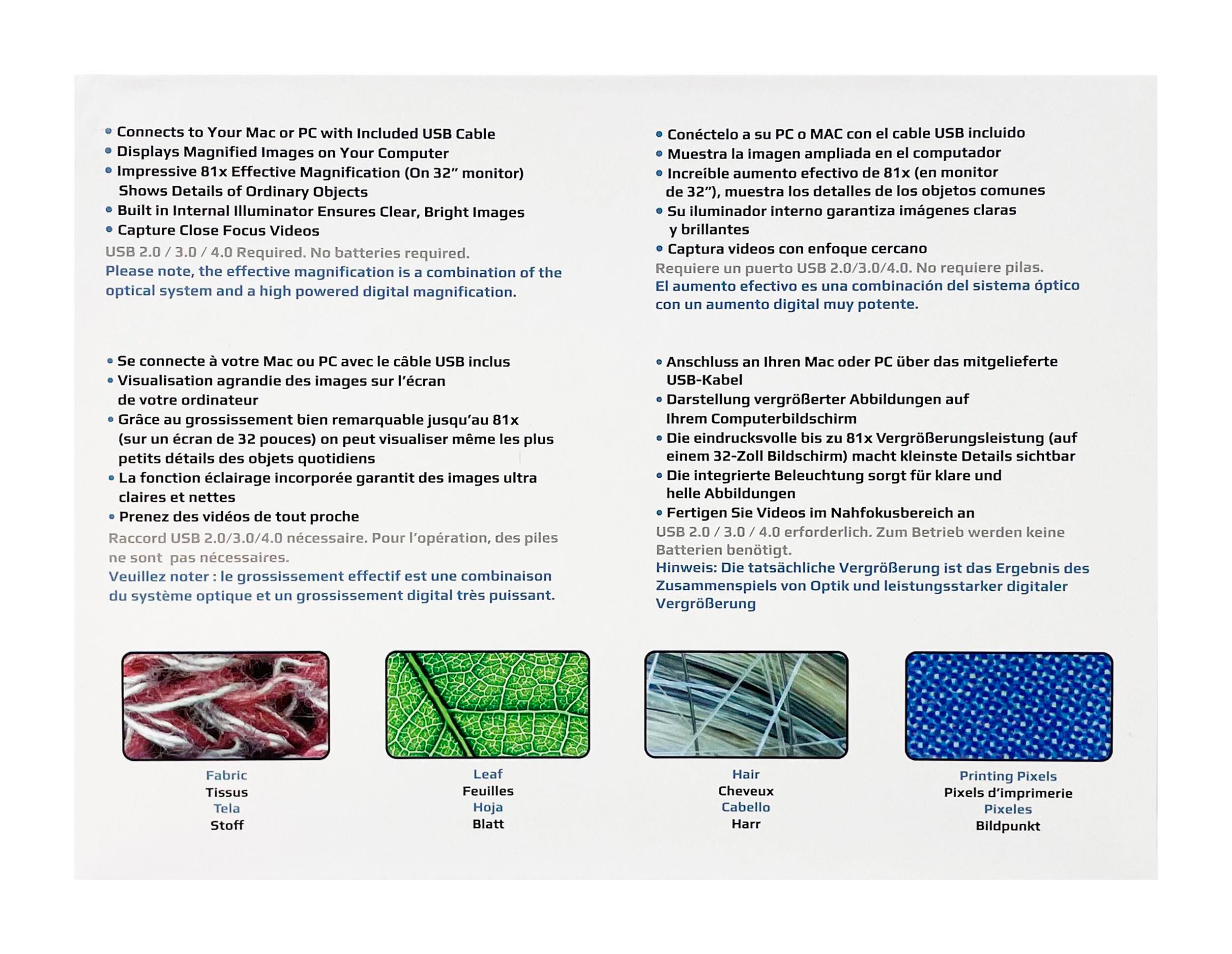 The MM-500 Zorb LED Lighted USB Digital Computer Microscope with 81x Effective Magnification is a digital microscope with an integrated camera that displays the magnified image right on your computer screen. The impressive 81x effective magnification (32 inch monitor) allows you to see details of ordinary objects you never knew existed! The built-in internal illumination ensures a clear and bright image. The Zorb digital microscope comes in Surf Blue color.Features