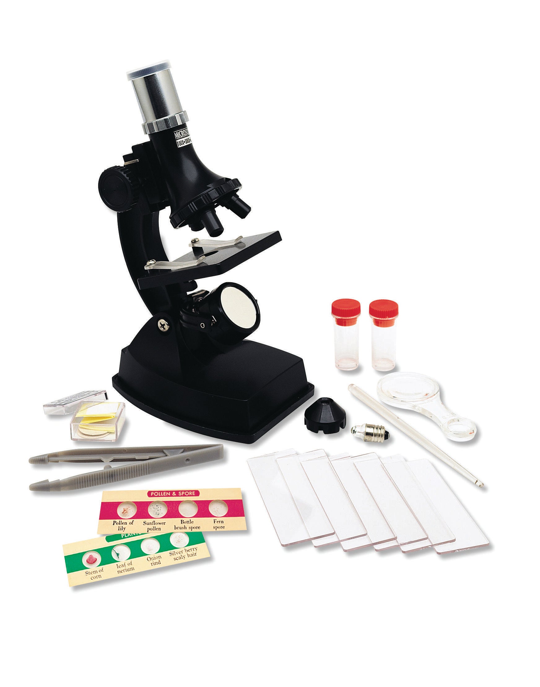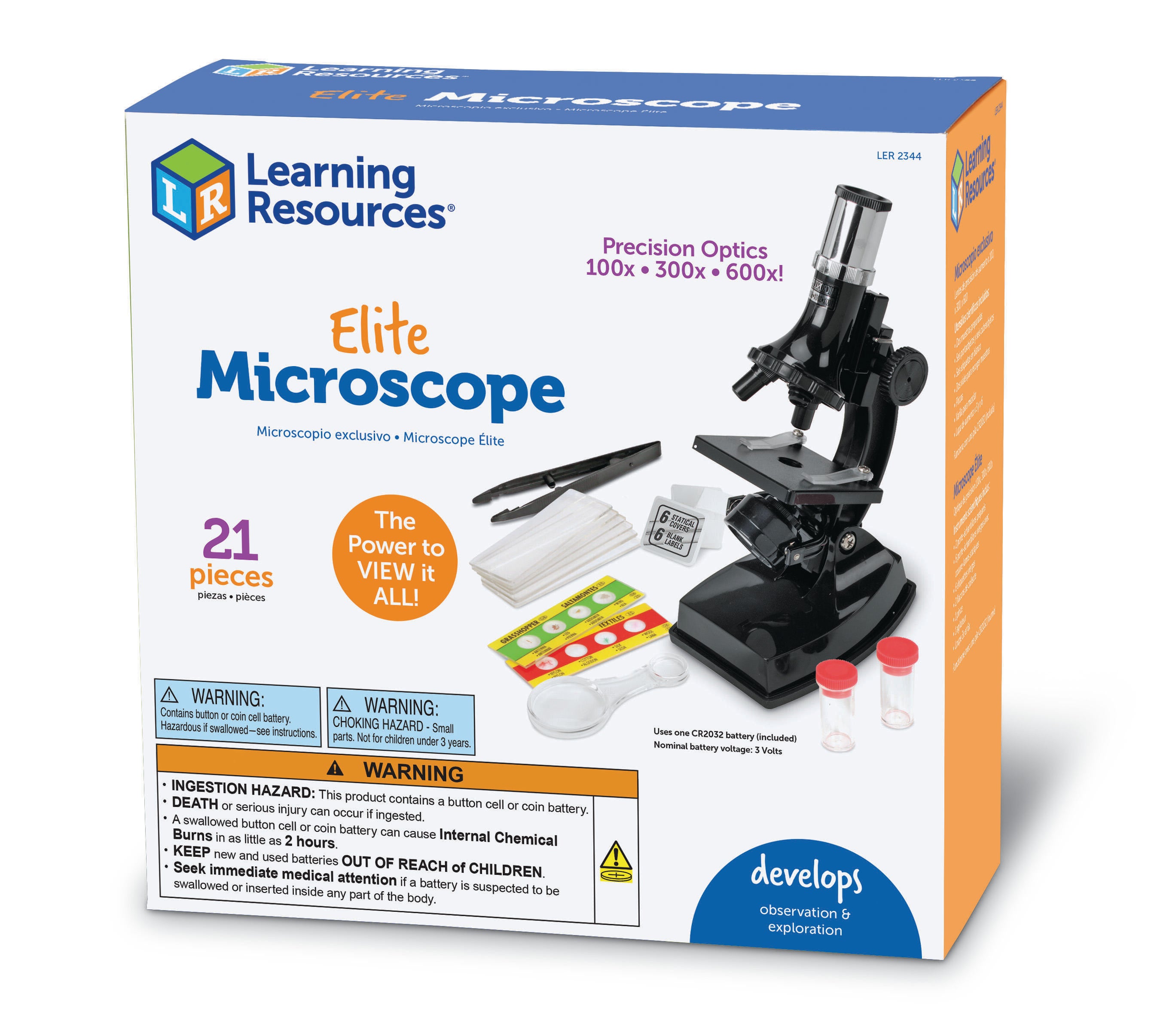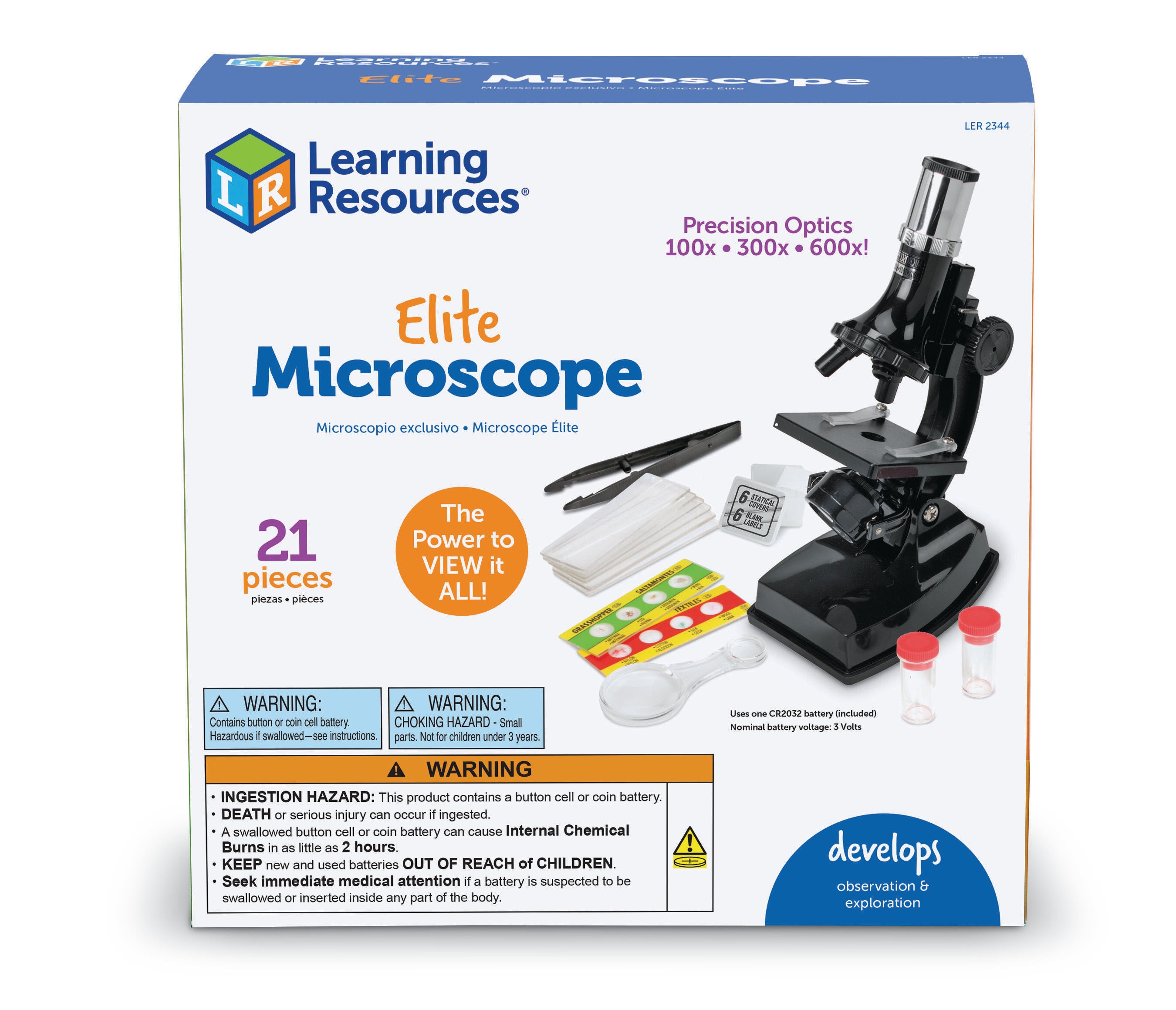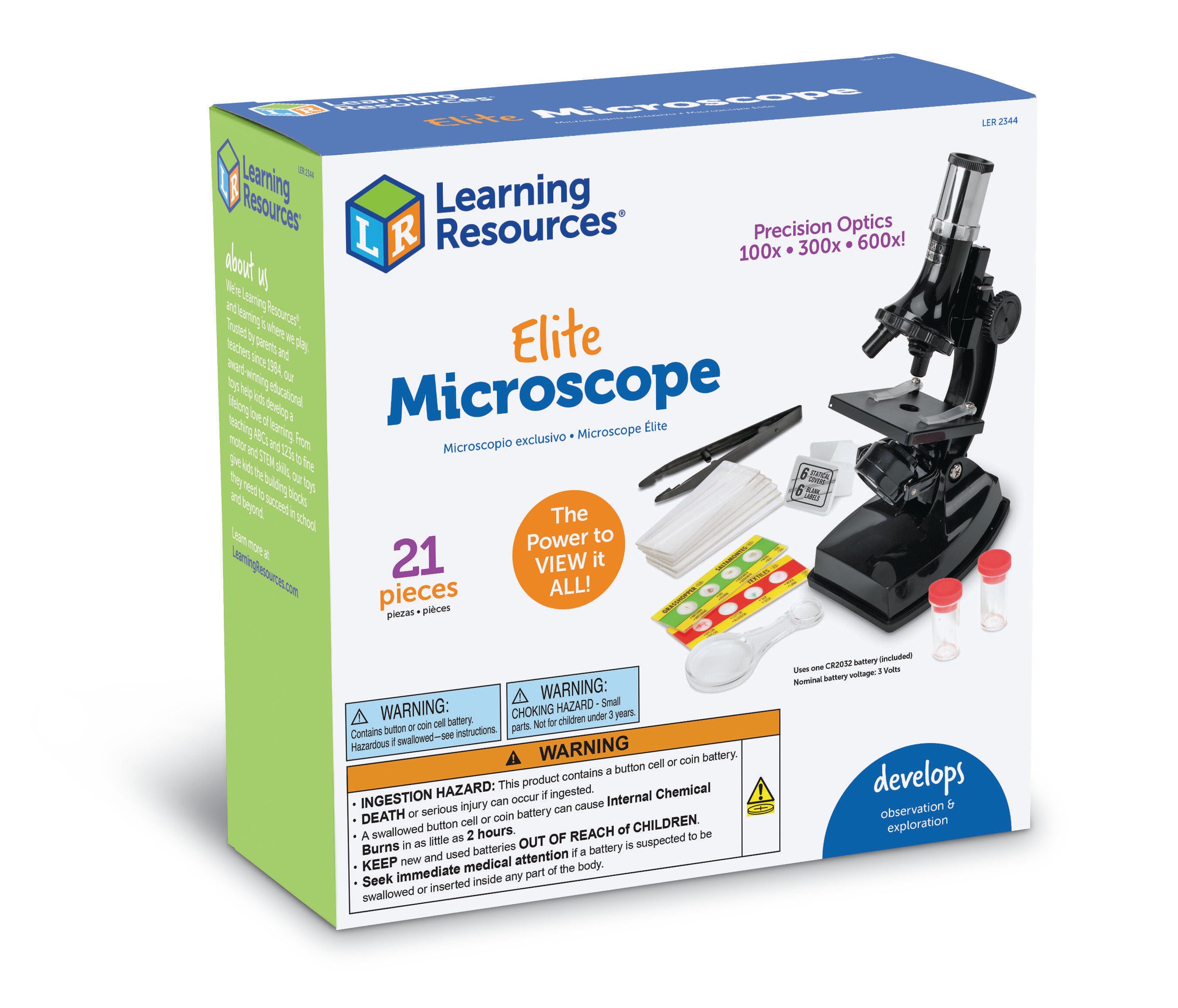 Learning Resources Elite Microscope features 100x, 300x and 600x magnification for easy viewing, perfect for viewing the prepared slides or other slides you've prepared for your early learning classroom. Includes mirror and light in the design for projection capabilities. Requires 2 AA batteries, not included. Ideal for ages 8 and up.Features