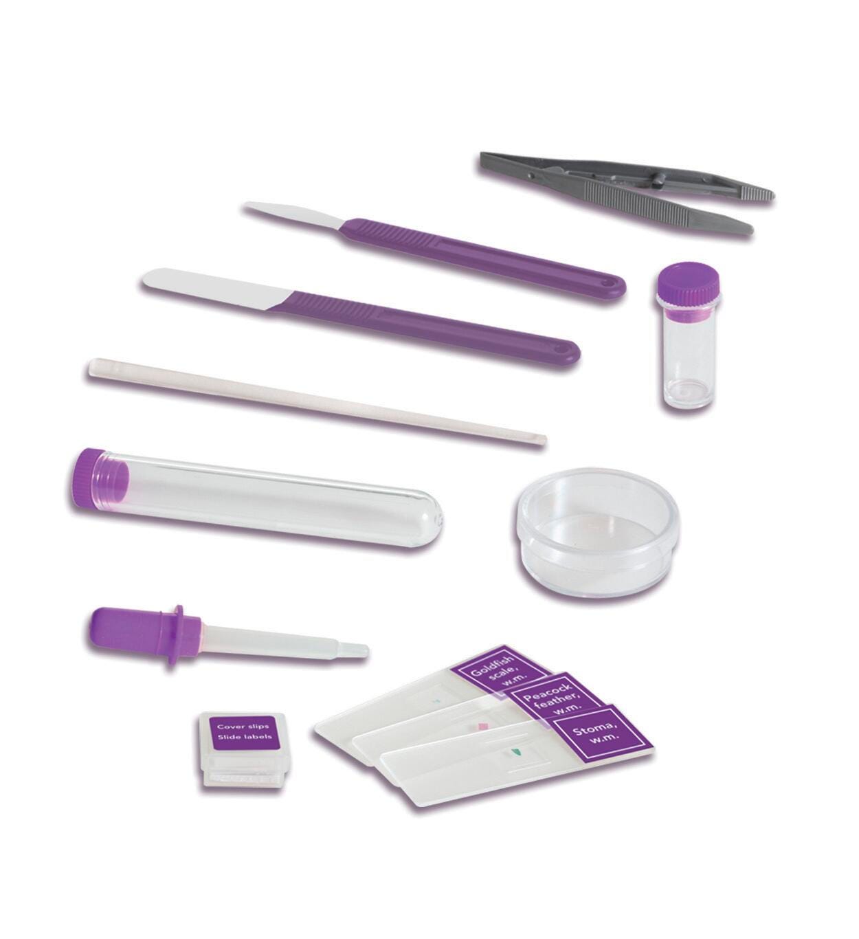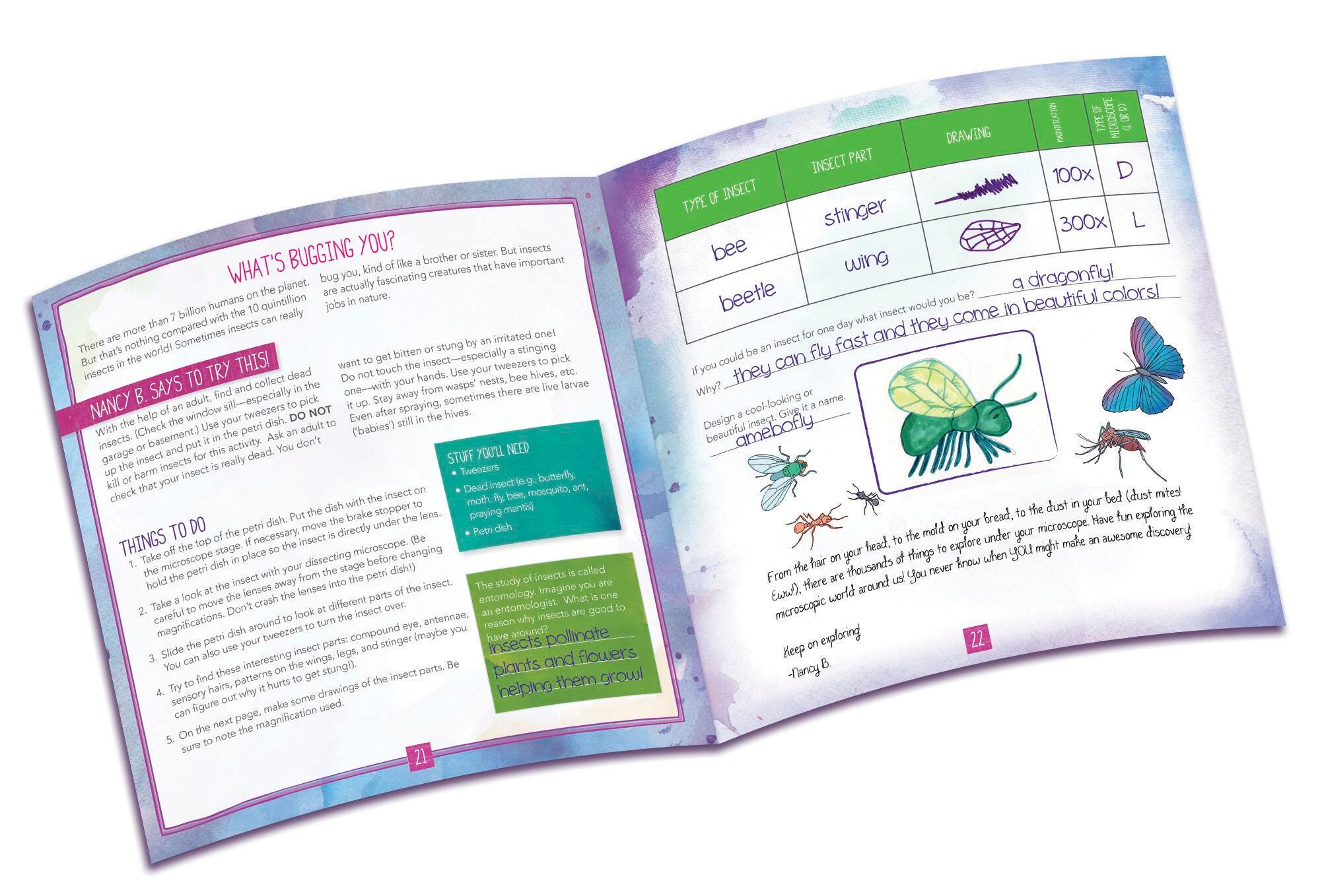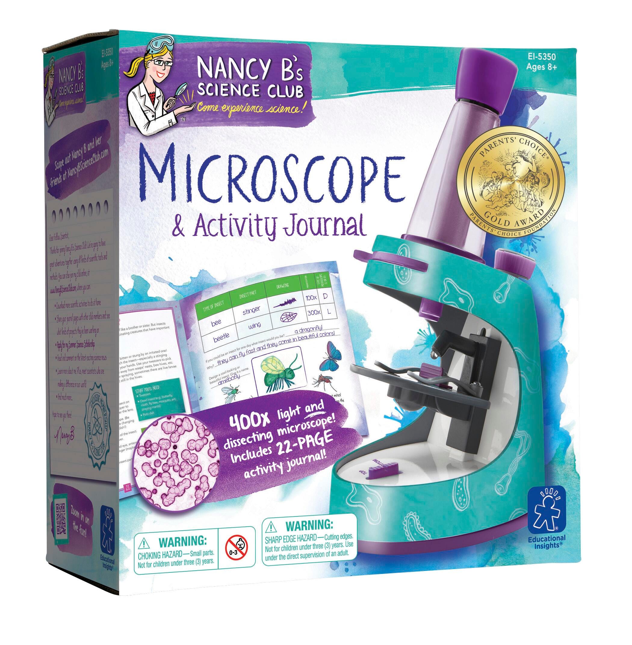 Educational Insights Nancy B's Microscope & Activity Journal includes 40+ piece dual microscope (2 LEDs transform the dissecting microscope into a light microscope) with magnification from 30x to 400x and twenty-two-page journal including activities and space for drawings, such as examining cells, looking at crystals, observing bugs, and viewing critters in water. Requires 3AAA batteries. Ages 8 to 11.