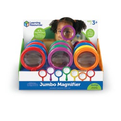 Jumbo Magnifiers allow you to observe on a grand scale and are sized perfectly for small hands. Ideal for taking a closer look at critters, rocks, fabric, and so much more! Flip-out stands on each magnifier allow for engaged, hands-free viewing. The plastic lens has a diameter of 4-1/2 inches and offers 4.5x magnification. Magnifiers are 8 inches long. Ages 3 and up. Set of 12.Features