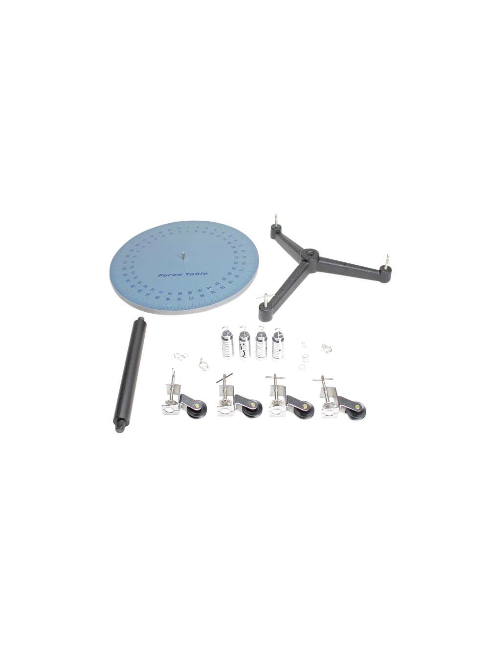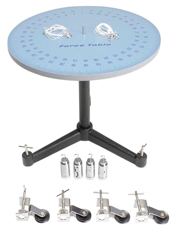 Frey Scientific Precision Force Table is used to accurately measure force, magnitude and direction. Suspension cords are used to fasten to the center ring and pass over 4 pulleys to end in loops for supporting applied masses. 46 centimeter Machined aluminum table featuring 13 millimeters thick rim that is graduated in deg does not warp like wood, levels with tripod base screws. Table with 40 centimeter diameter consists of suspension cord, 4 hangers and four 10 gram, eight 20 gram, twelve 50 gram as well as eight 100 gram slotted weights.Features