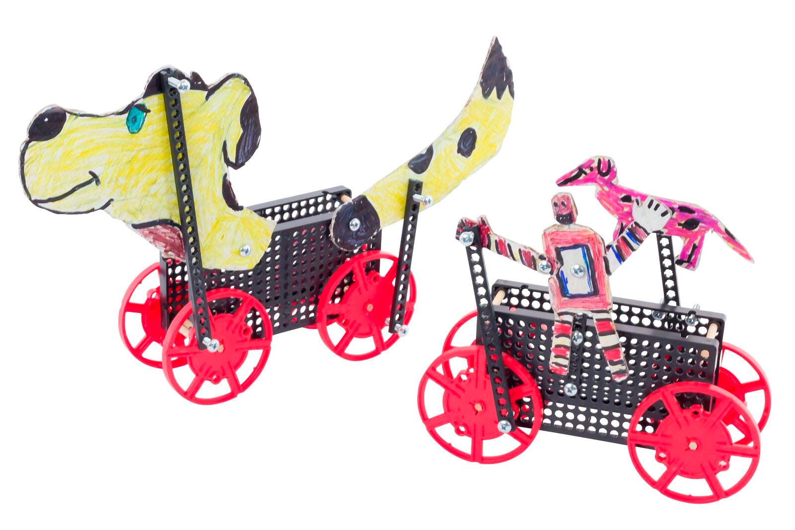 Kids create their own unique "pull-toy" prototypes with animated parts that move as they roll! Watch as tails wag, heads bob, hands wave or wrestlers "wrassle." Kids will follow the engineering design process to brainstorm, construct, test, and redesign innovative "toys." From simple machines to linkages and mechanical advantage, kids can explore tons of science and engineering principles as they make and test different designs. The Toy Design Workshop is also an excellent introduction to marketing and entrepreneurship, as kids can develop brand identities, logos, and sale pitches for their creations. Grades 3 – 8+ (different documents for different ages). Some adult assistance is helpful for 3rd-graders. TeacherGeek is not a toy; it’s way better! Kids love making real things, especially when they get to use age-appropriate tools. Kids will need a TeacherGeek Multi-Cutter, TeacherGeek Reamer, and a Phillips screwdriver.Features