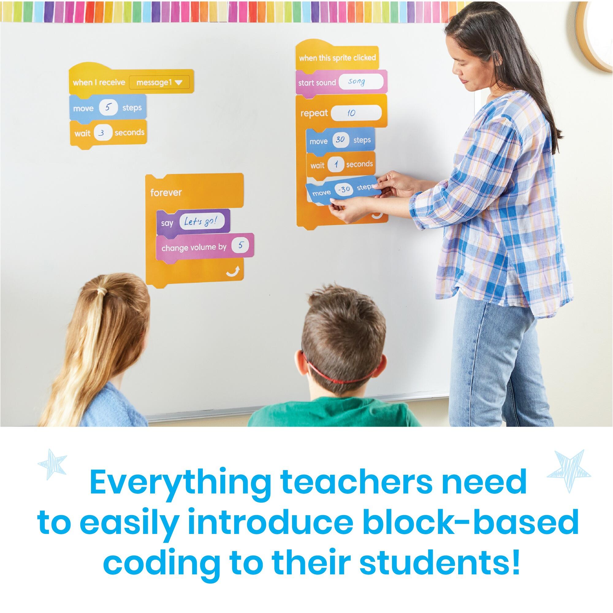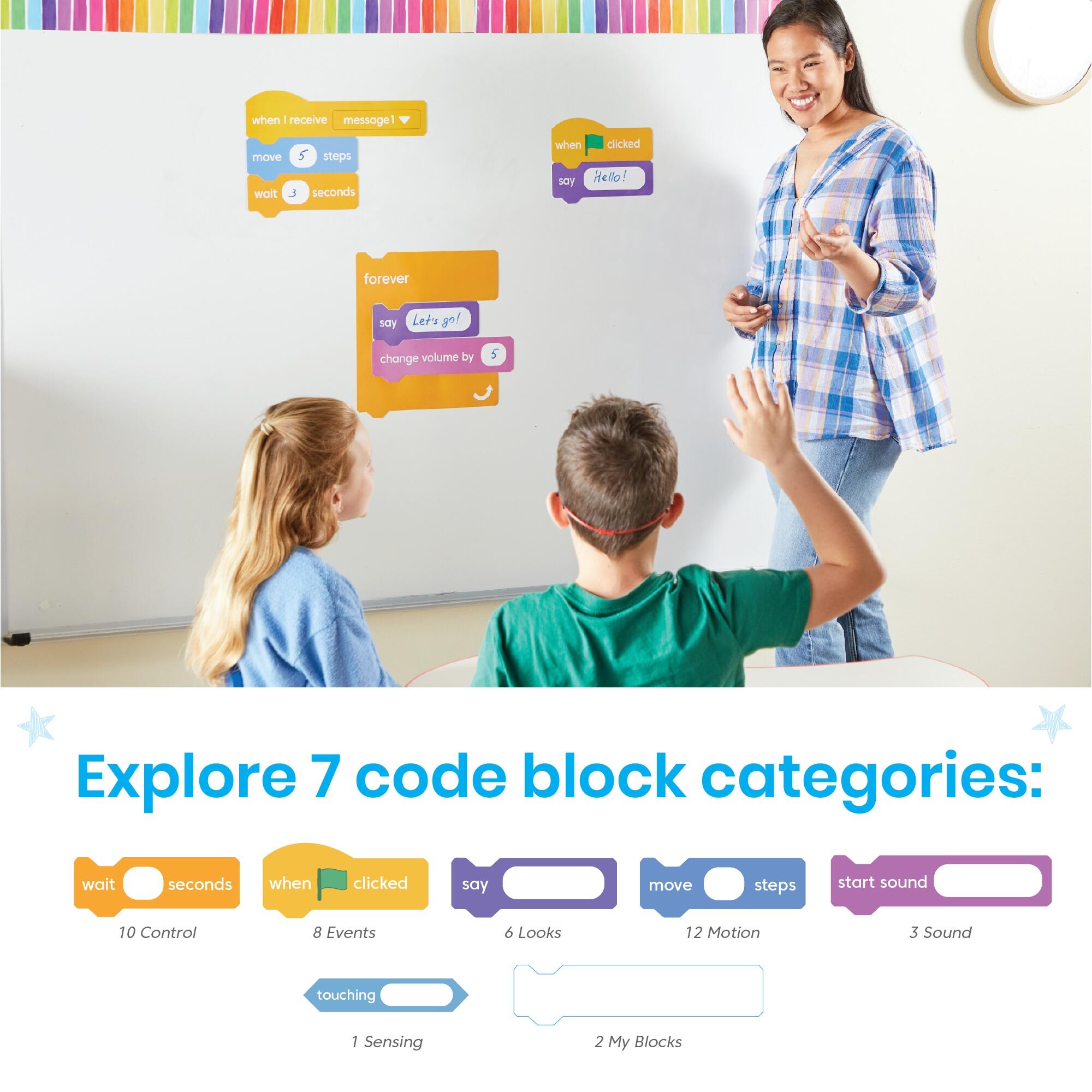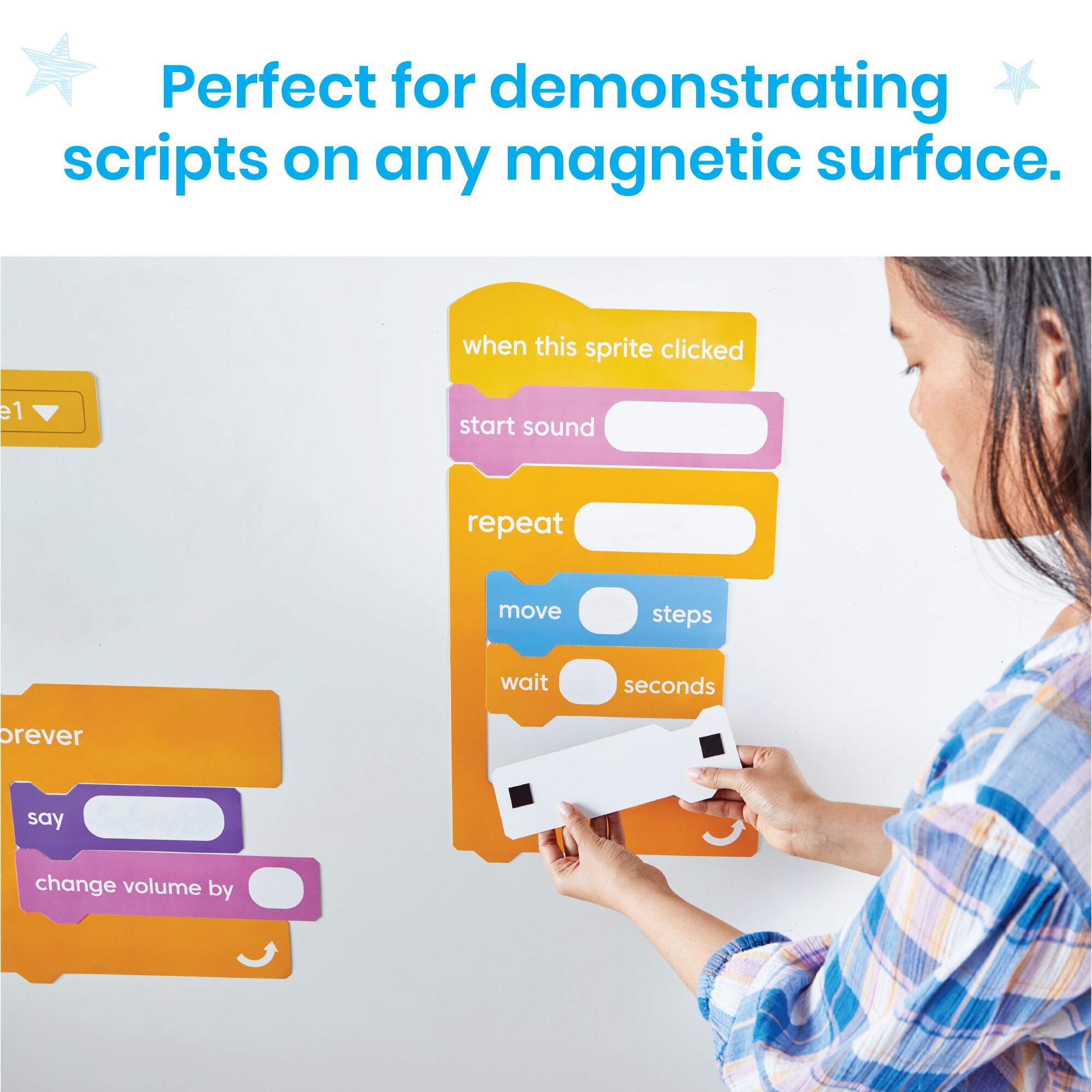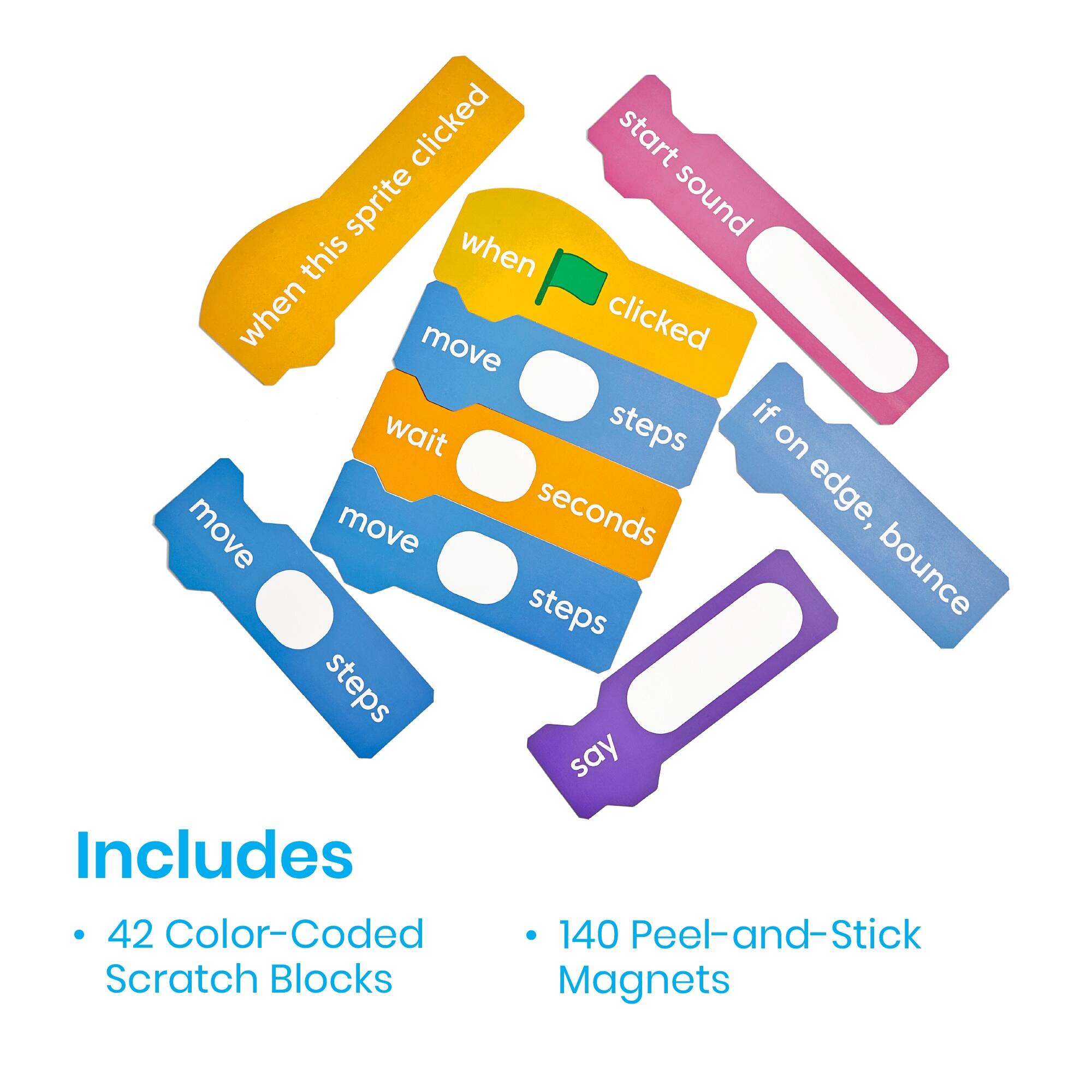 Enhance your classroom coding experience with a magnetic demonstration set designed to extend the Scratch coding language. This set includes a getting started guide, 42 color-coded dry-erase coding blocks, and peel-and-stick magnets, perfect for building and demonstrating scripts on any magnetic surface. Scratch is owned and provided by the Scratch Foundation and was originally developed by Prof. Mitchel Resnick and his Lifelong Kindergarten group at the MIT Media Lab. Scratch is available for free at www.scratch.mit.edu and can also be downloaded on the App Store, Google Play, and Microsoft Store. you can learn more about Scratch and the Scratch Foundation at www.scratch.org.Features